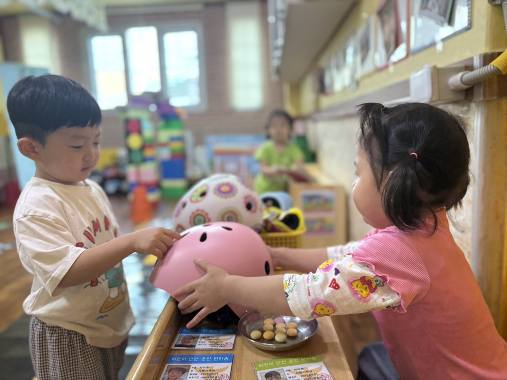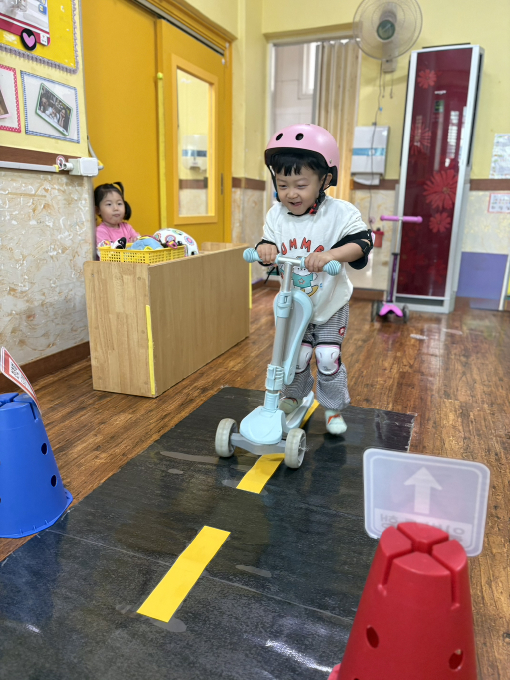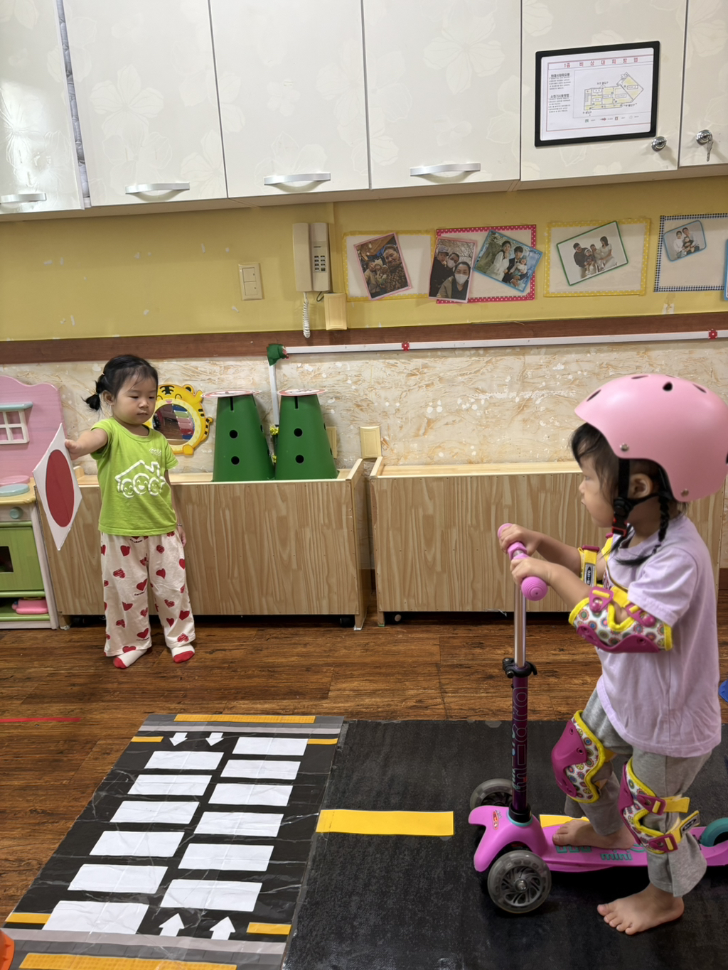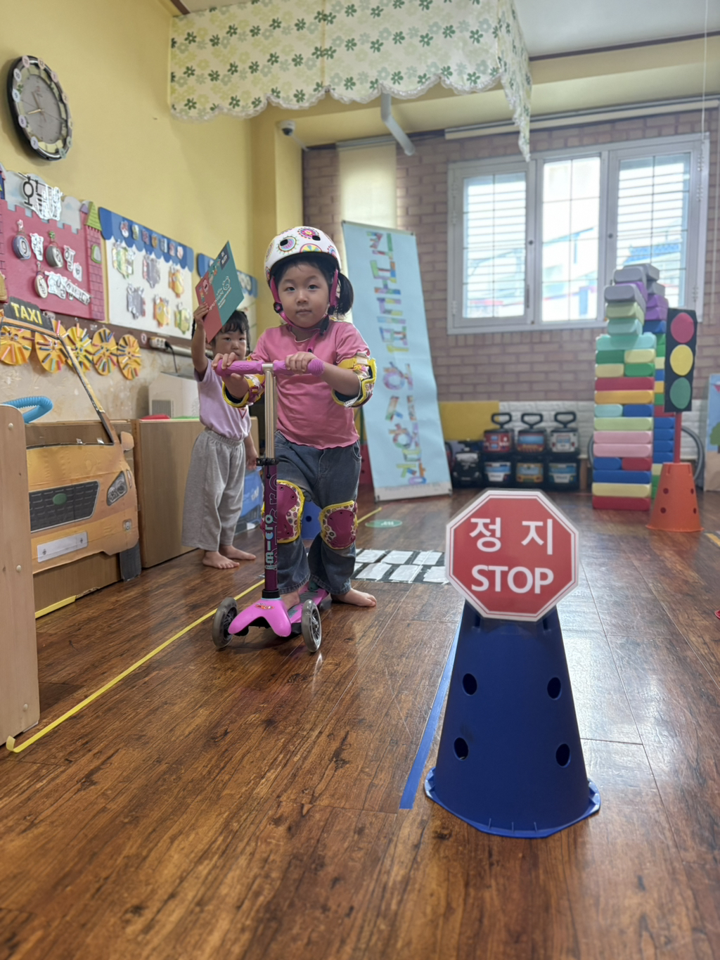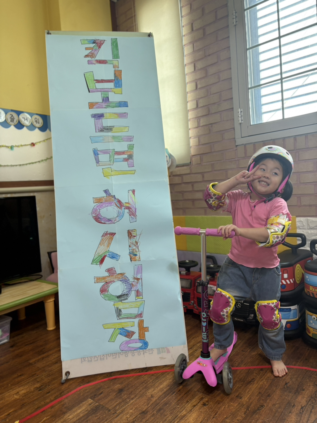 일찍 등원한 사랑둥이들이 ‘킥보드 면허 시험장’ 간판을 만들었어요🛴
