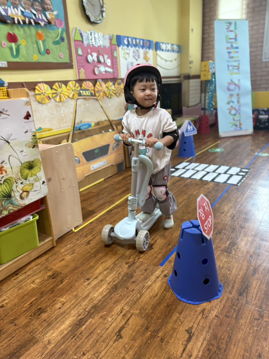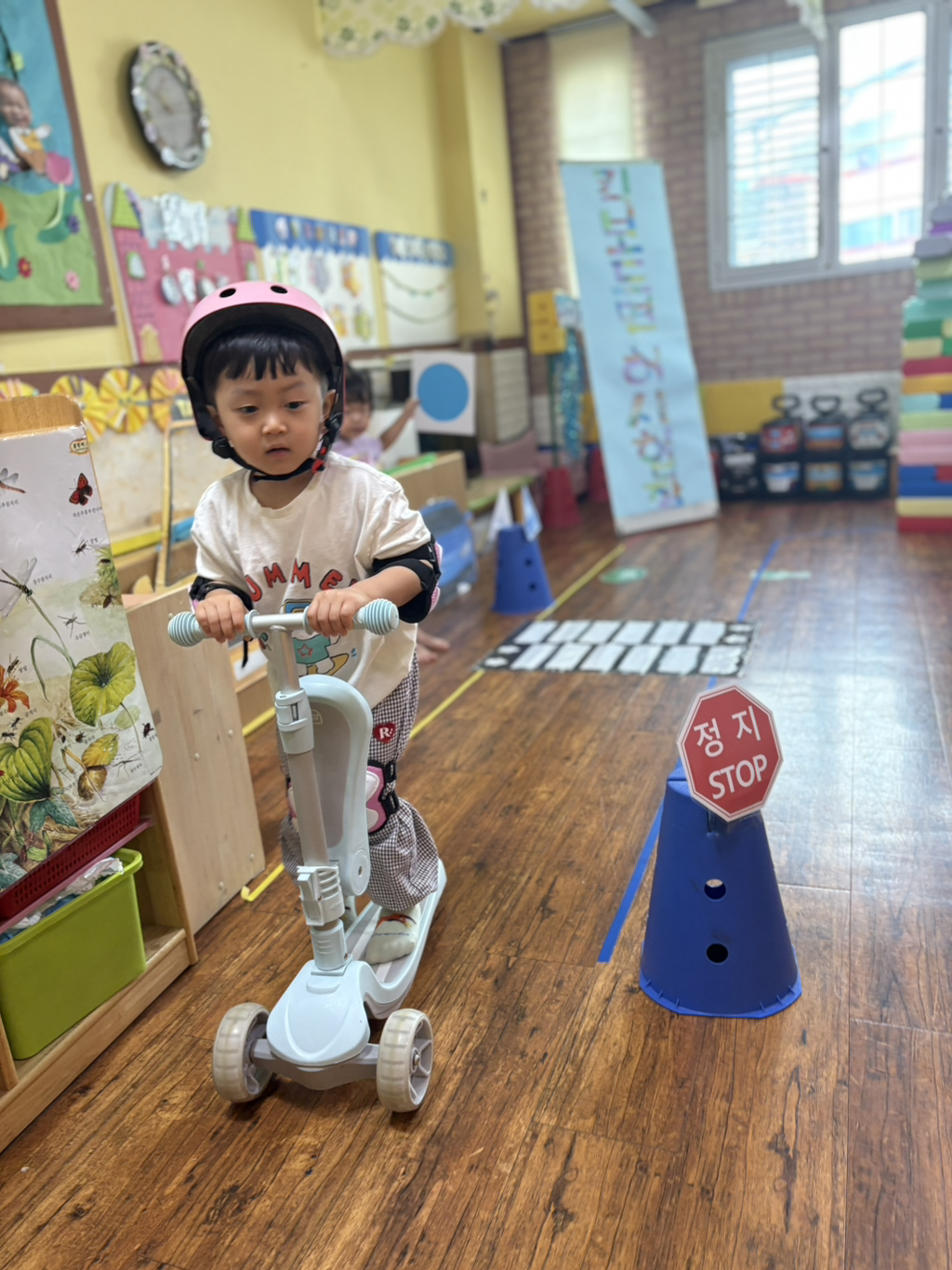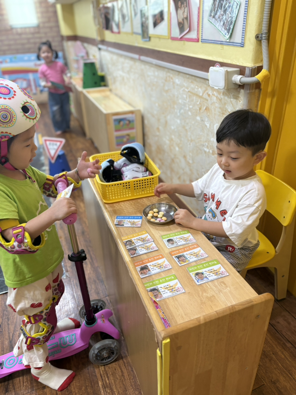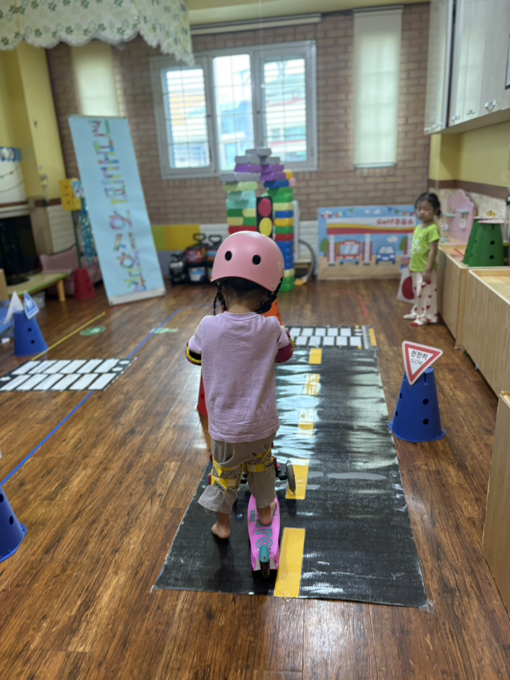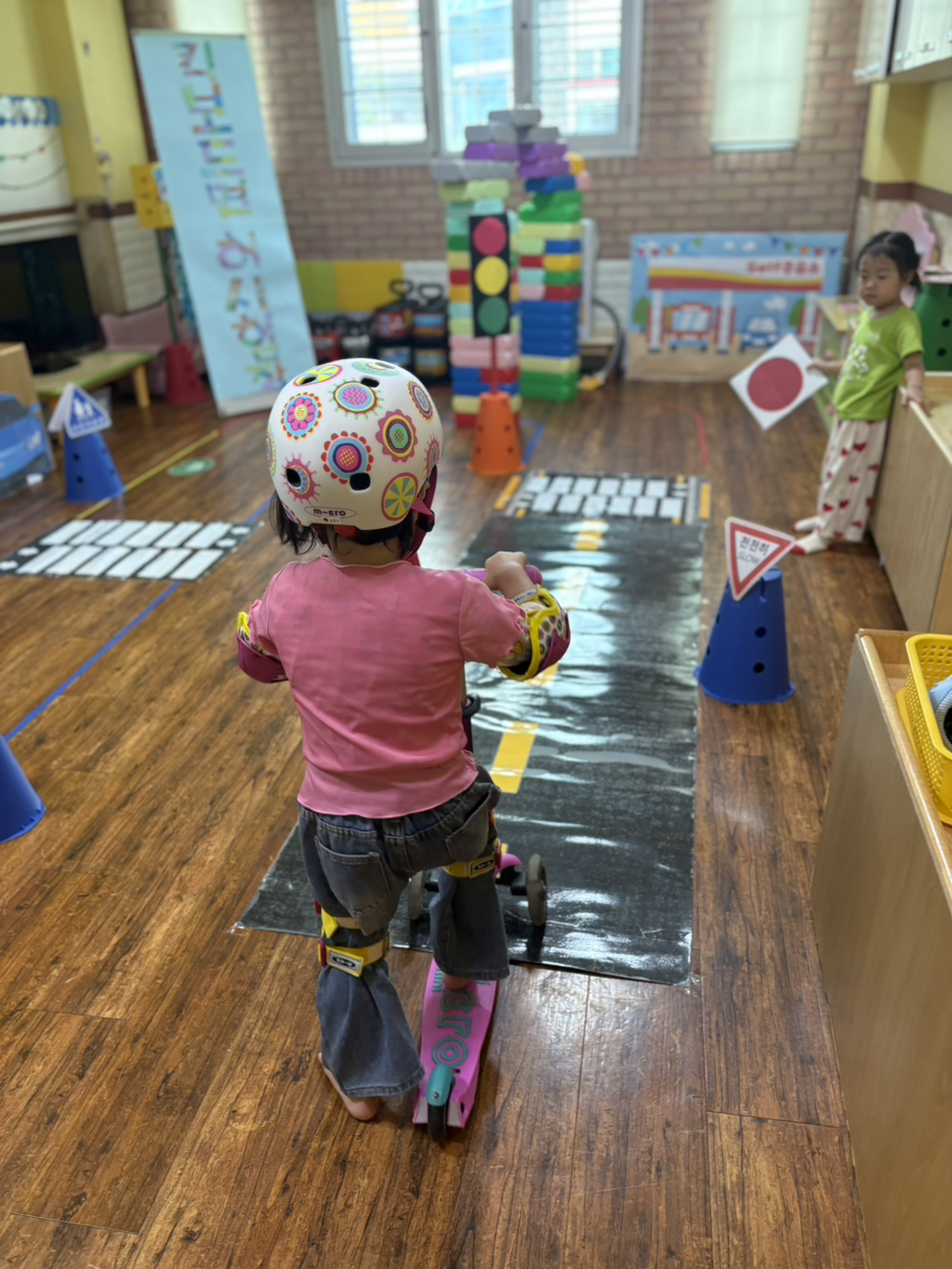 일찍 등원한 사랑둥이들이 ‘킥보드 면허 시험장’ 간판을 만들었어요🛴