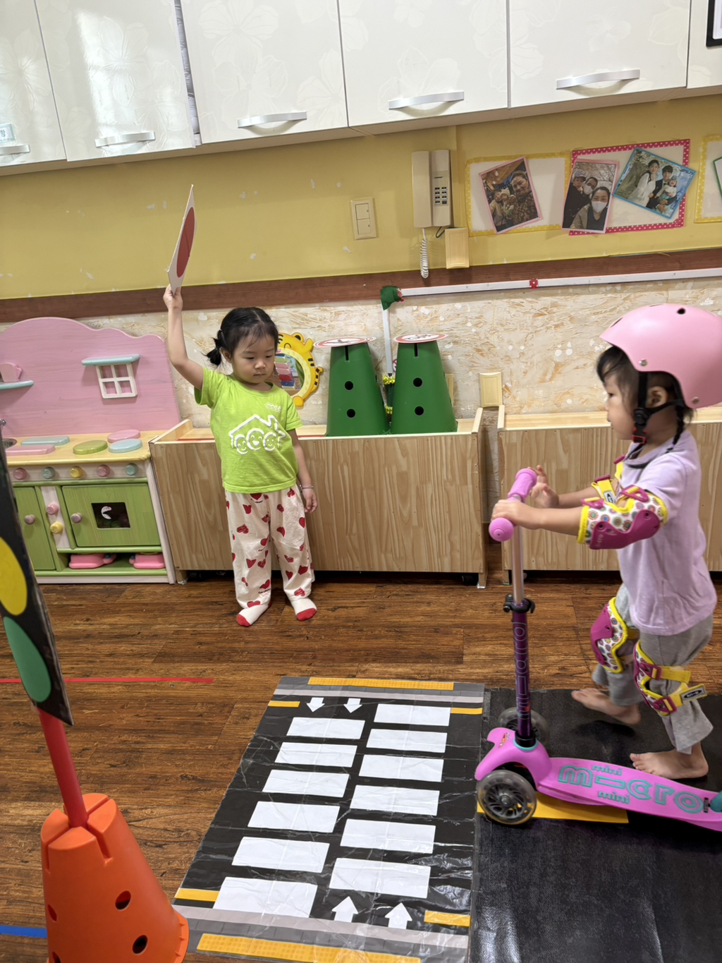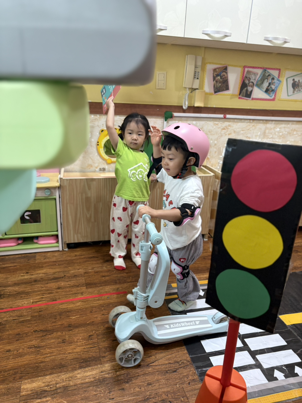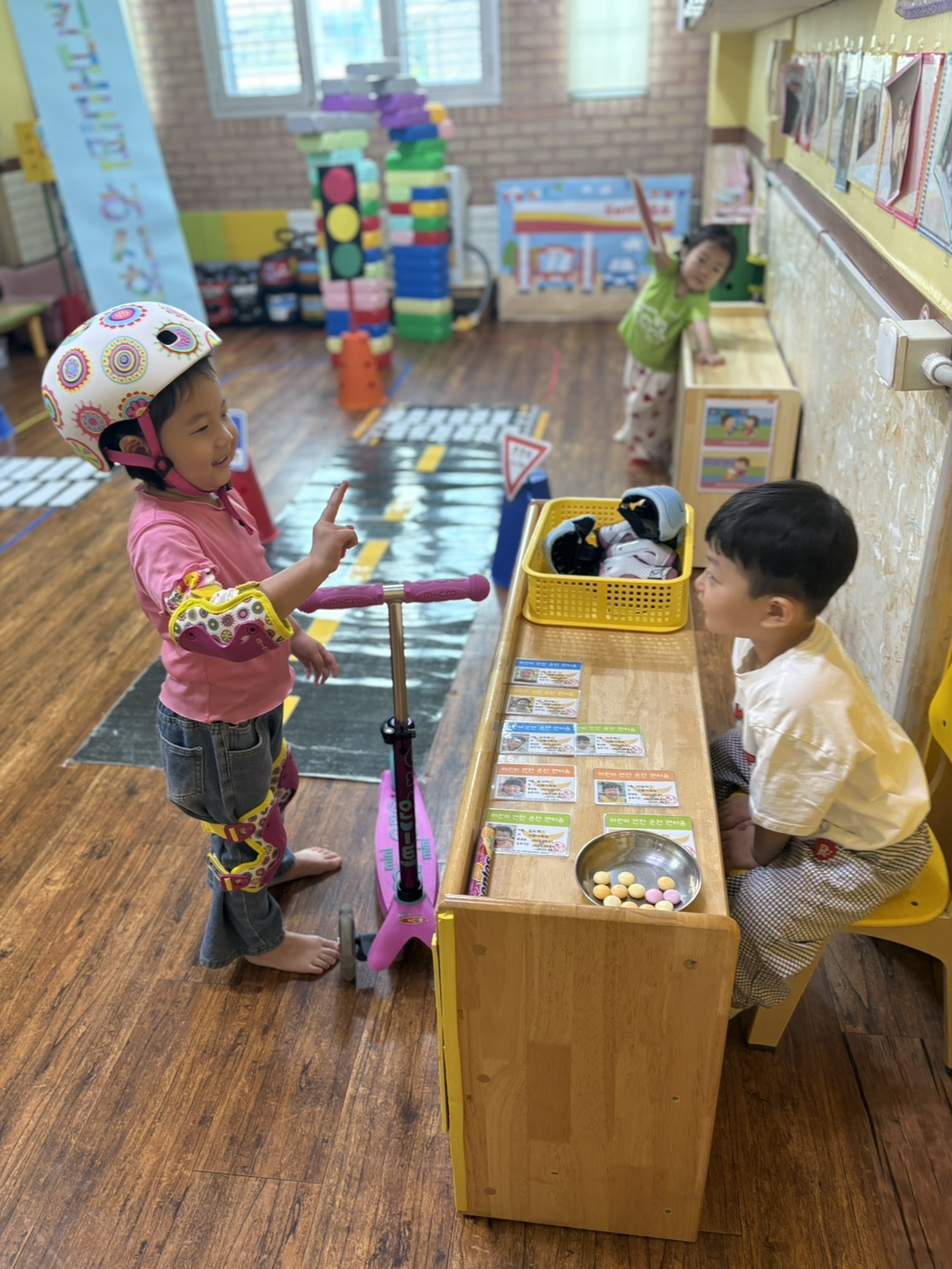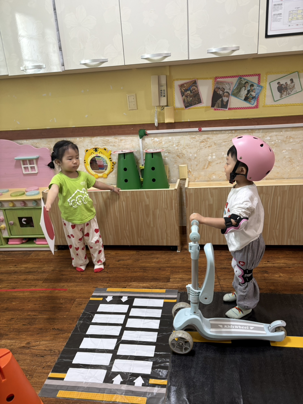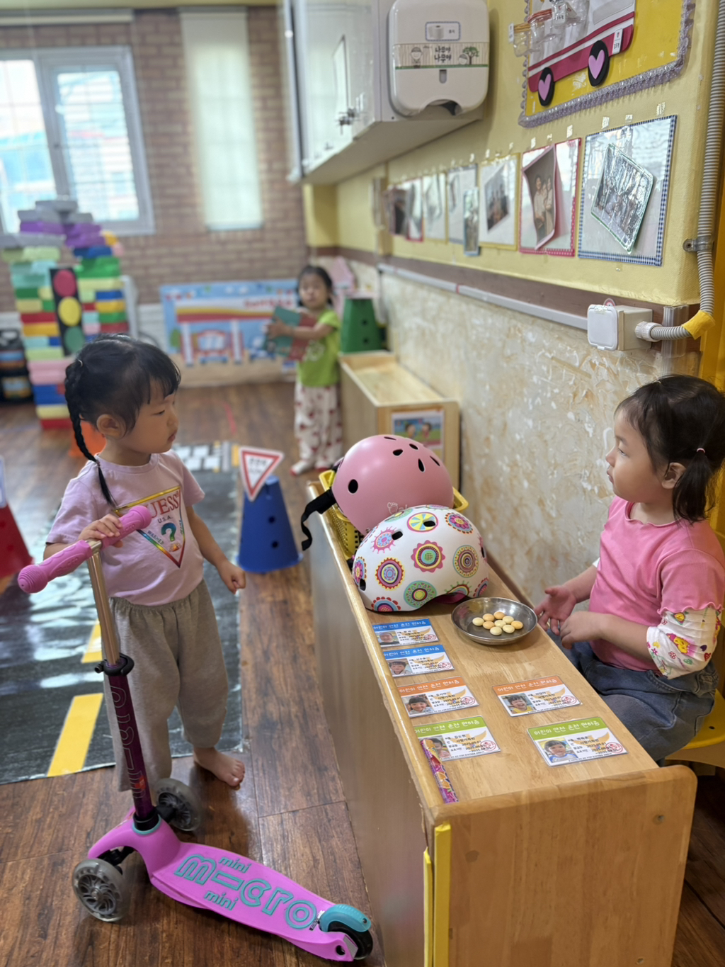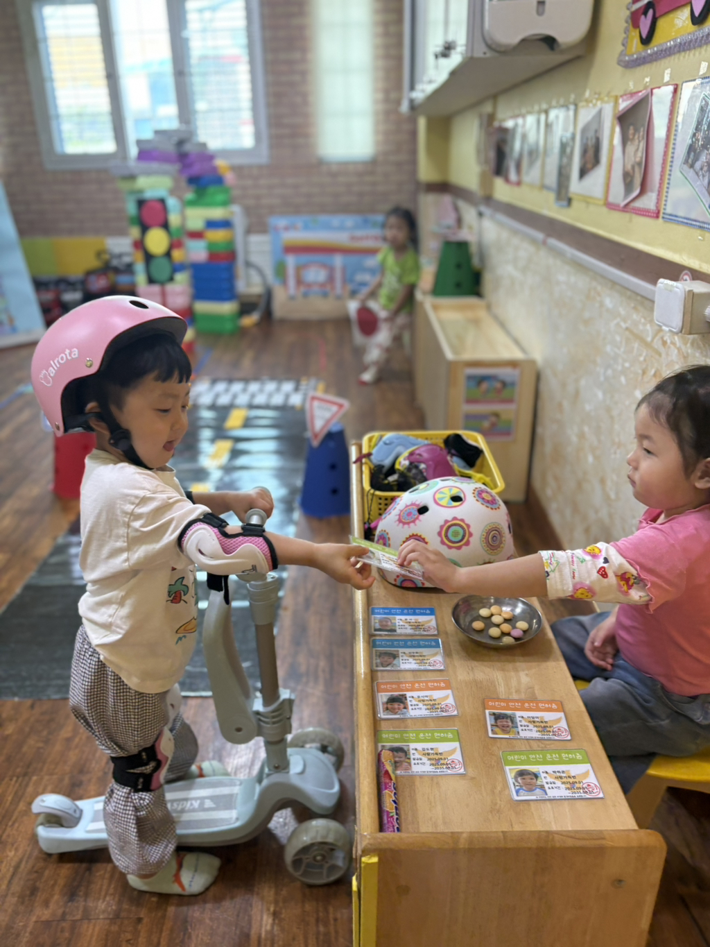 일찍 등원한 사랑둥이들이 ‘킥보드 면허 시험장’ 간판을 만들었어요🛴