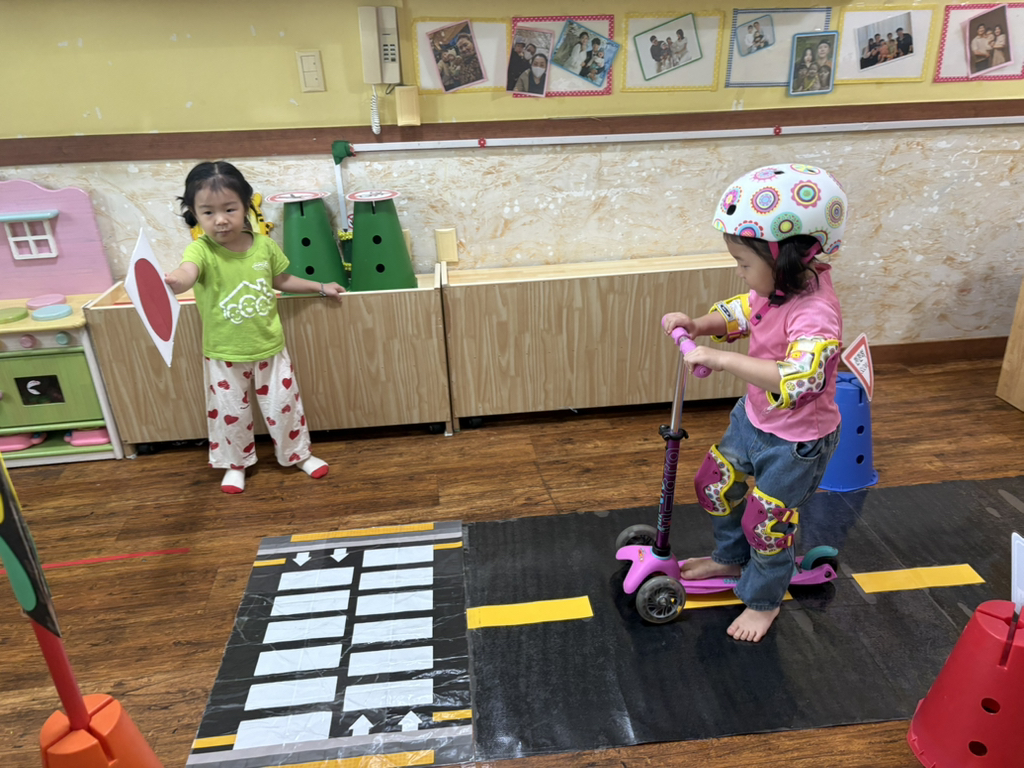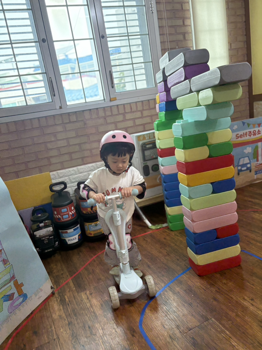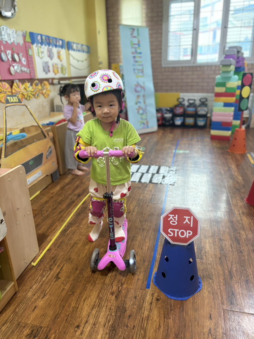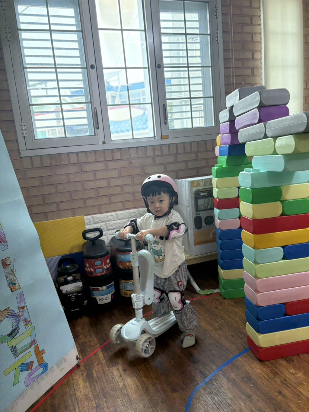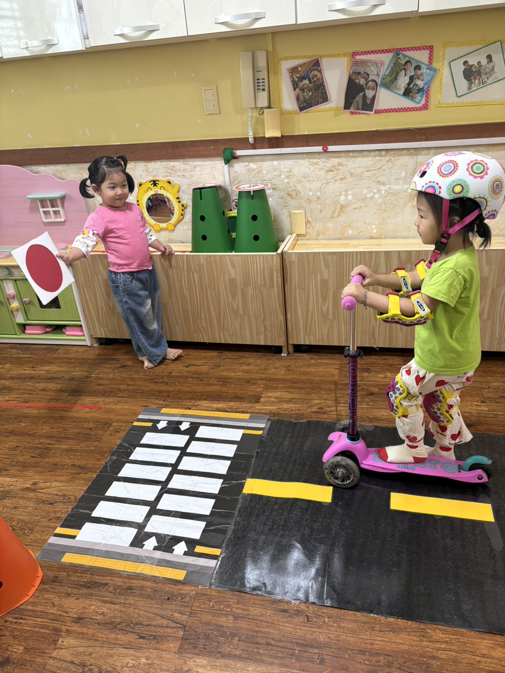 일찍 등원한 사랑둥이들이 ‘킥보드 면허 시험장’ 간판을 만들었어요🛴