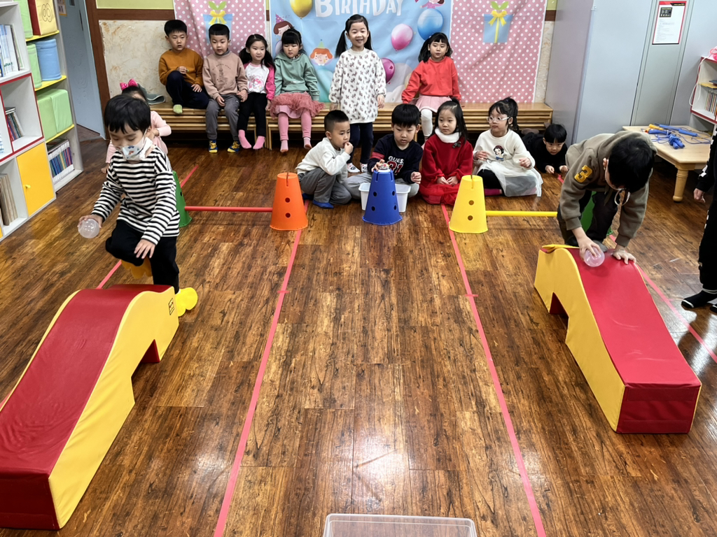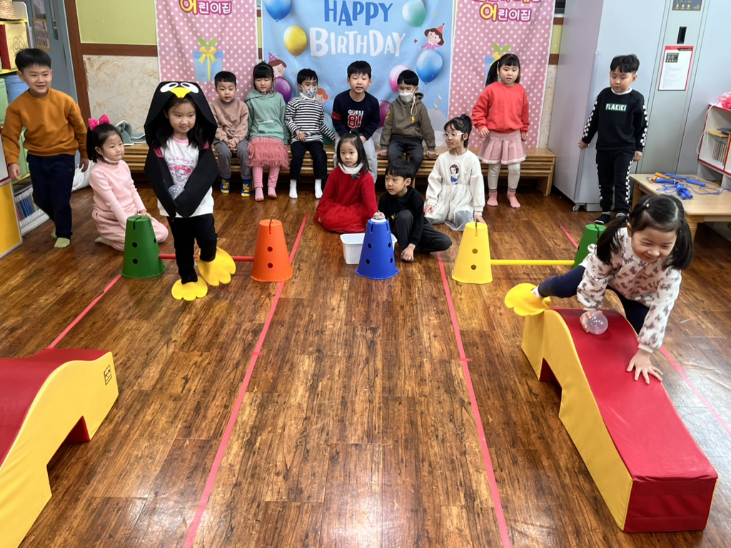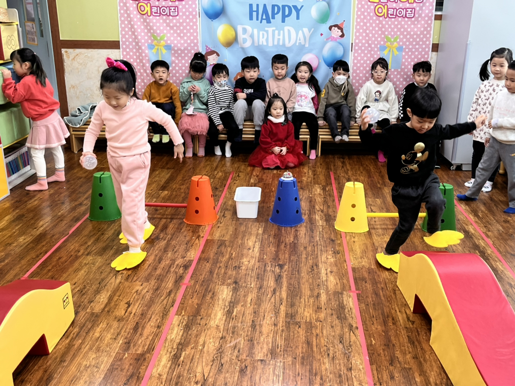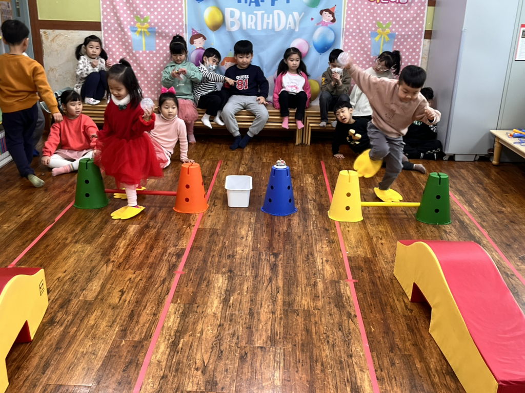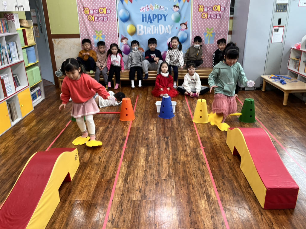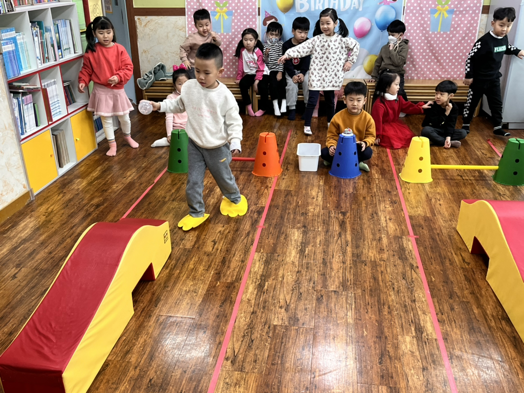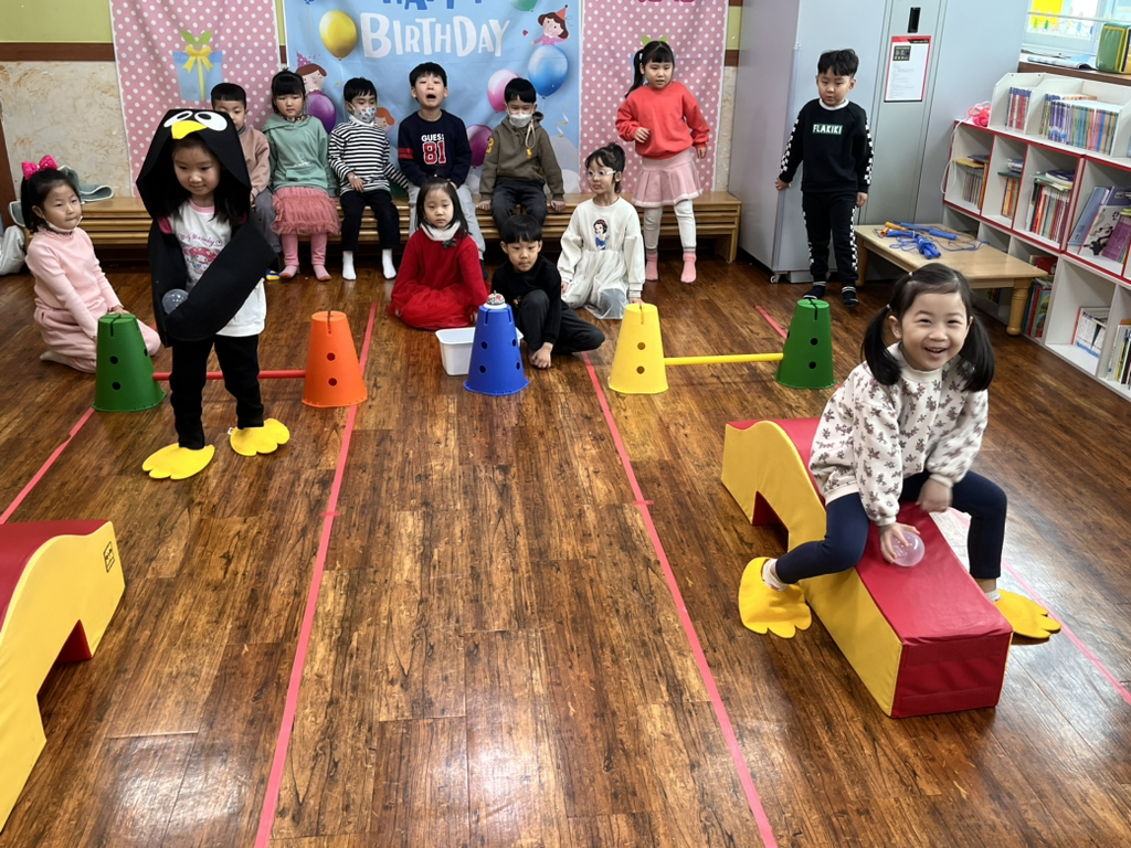 펭귄 발을 신어본 뒤 장애물을 넘어가서 나무 블록을 내 나이 7만큼 쌓아보고 돌아오면 승리 ✌️펭귄 발을 신어서 조금 어려웠지만 재밌다던 슬기들 ^^