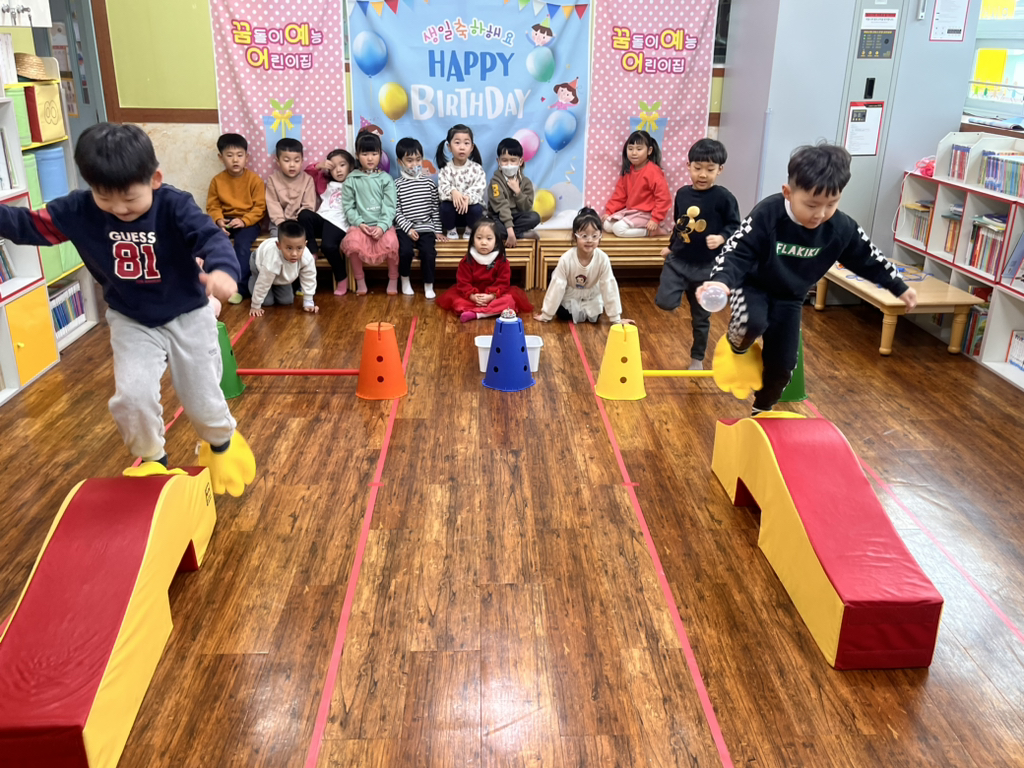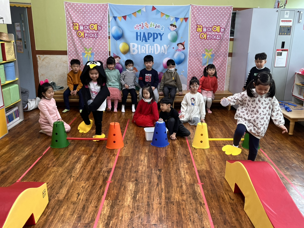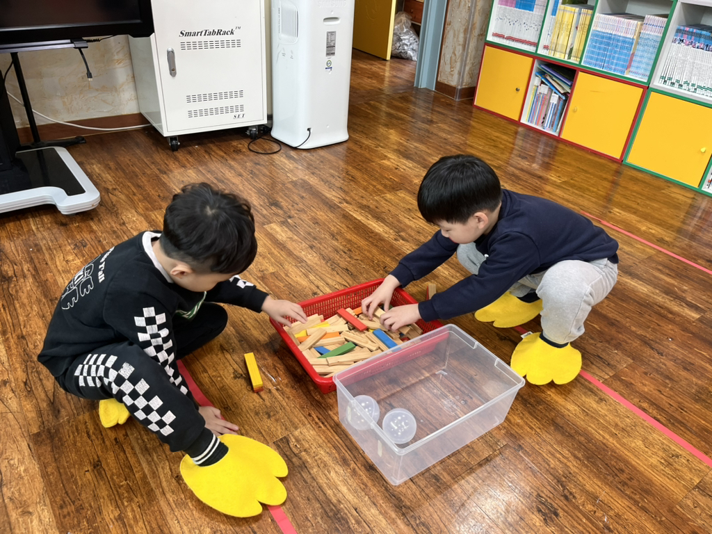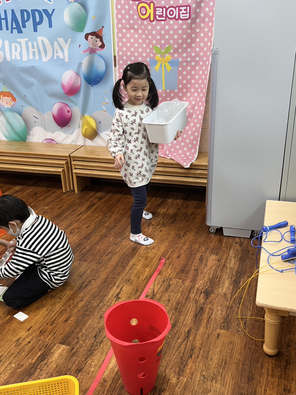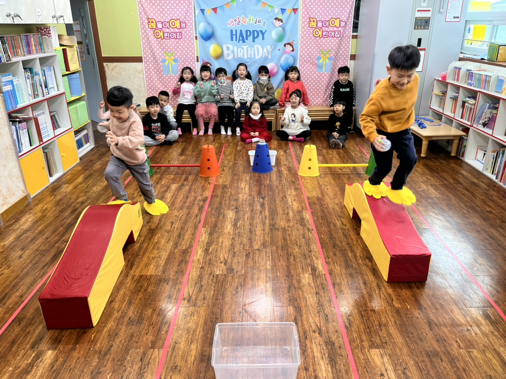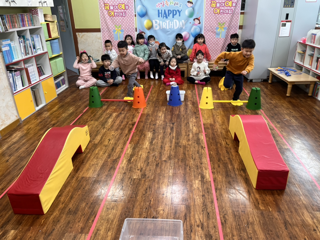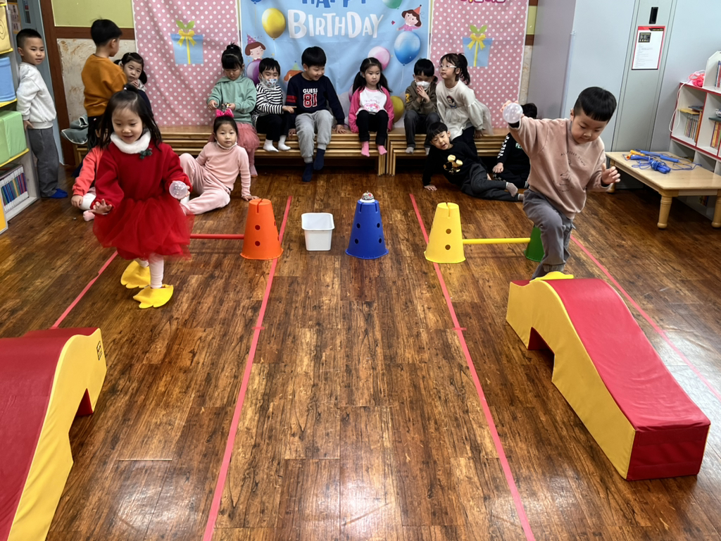 펭귄 발을 신어본 뒤 장애물을 넘어가서 나무 블록을 내 나이 7만큼 쌓아보고 돌아오면 승리 ✌️펭귄 발을 신어서 조금 어려웠지만 재밌다던 슬기들 ^^