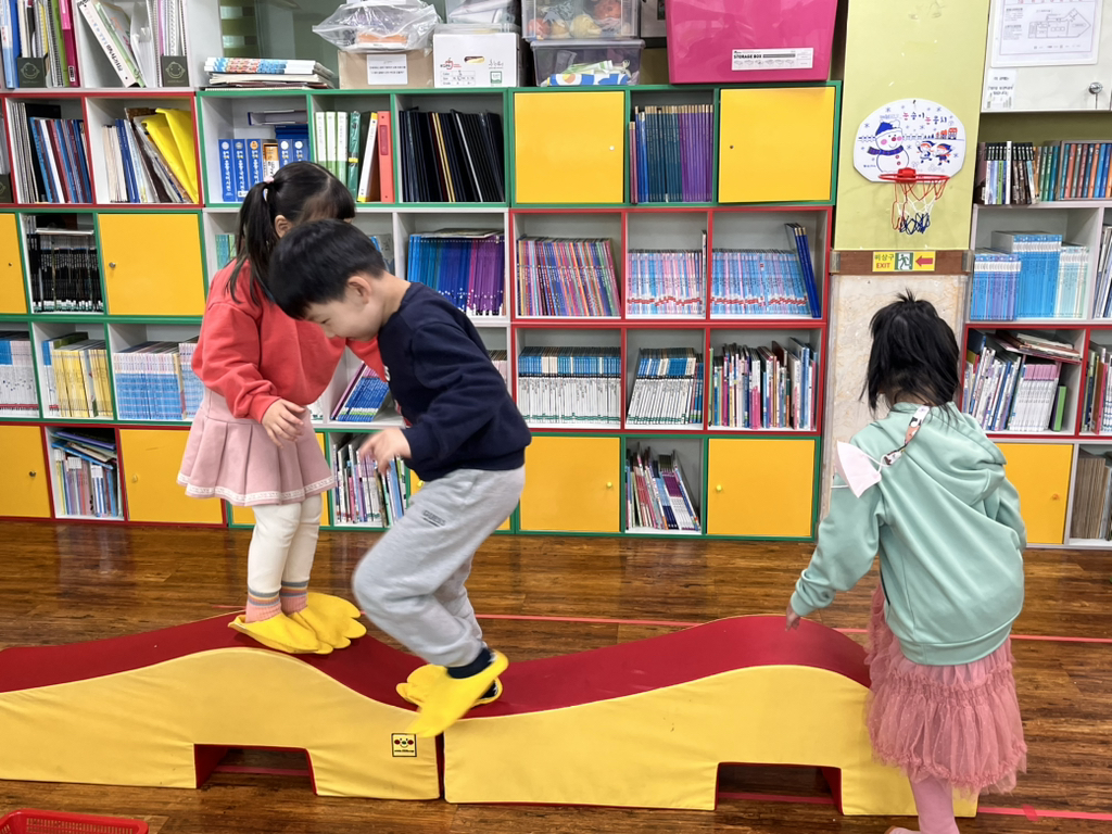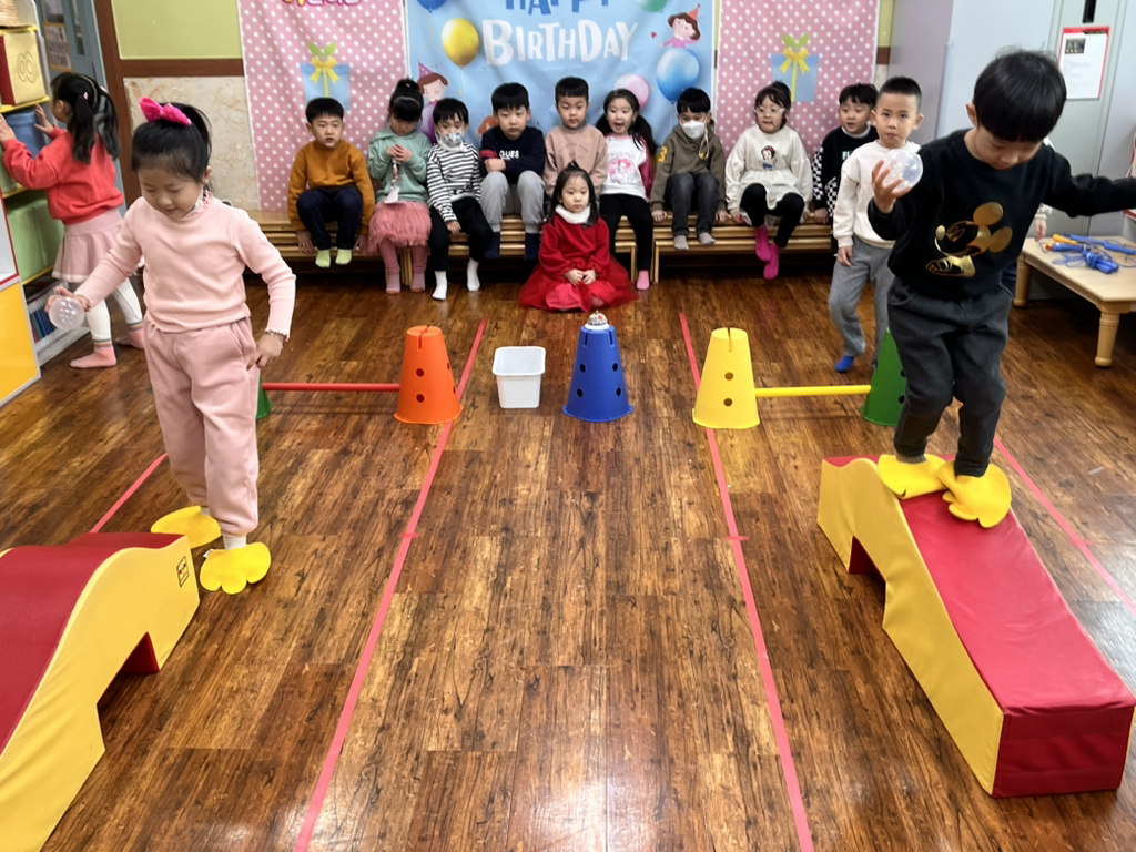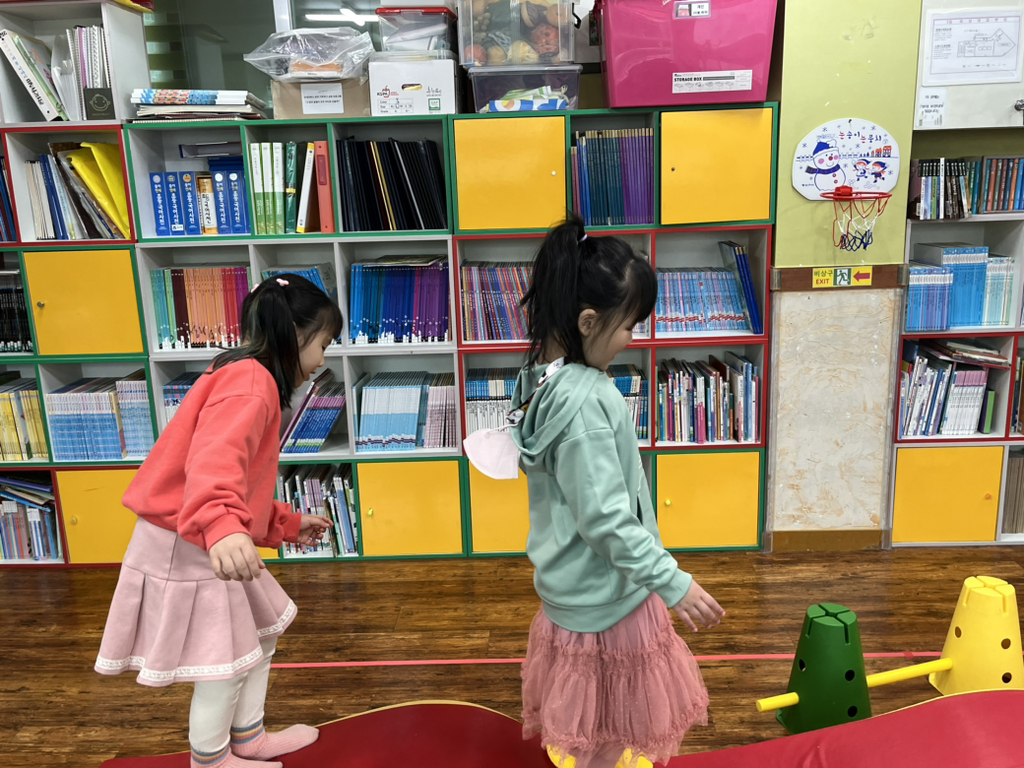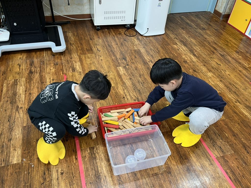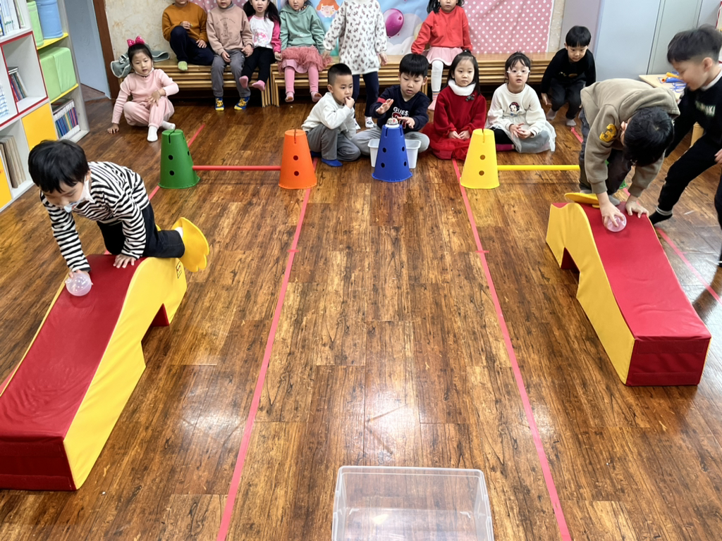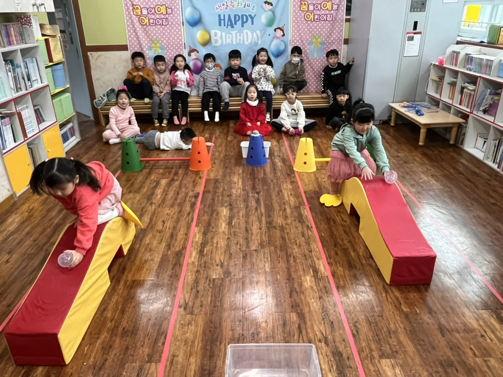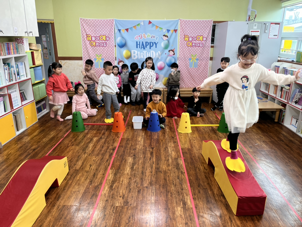 펭귄 발을 신어본 뒤 장애물을 넘어가서 나무 블록을 내 나이 7만큼 쌓아보고 돌아오면 승리 ✌️펭귄 발을 신어서 조금 어려웠지만 재밌다던 슬기들 ^^