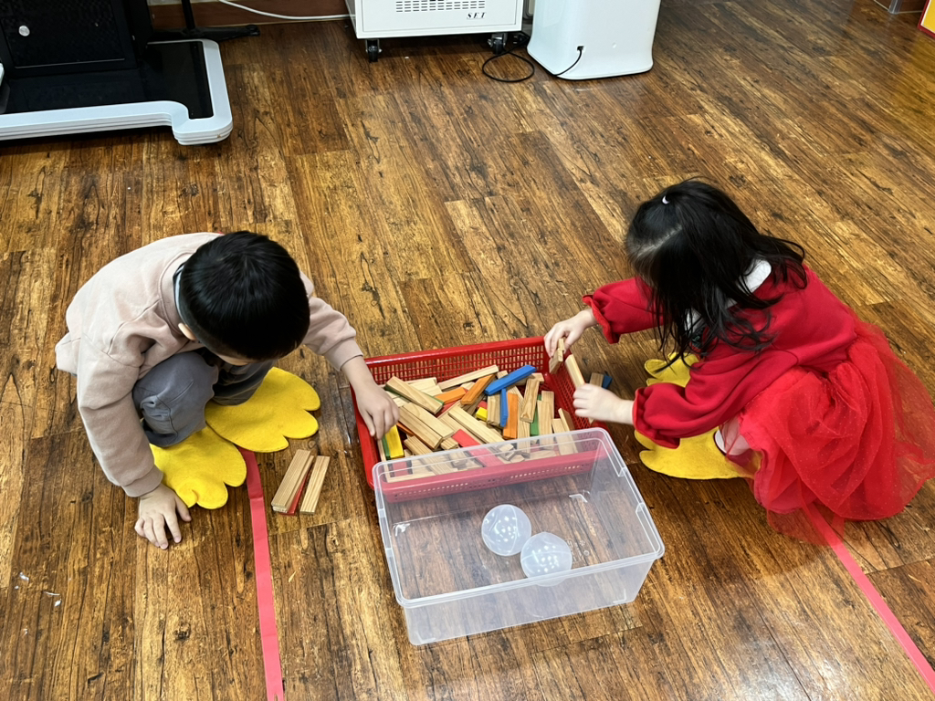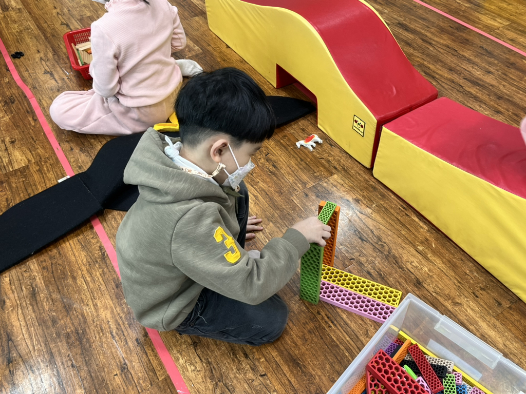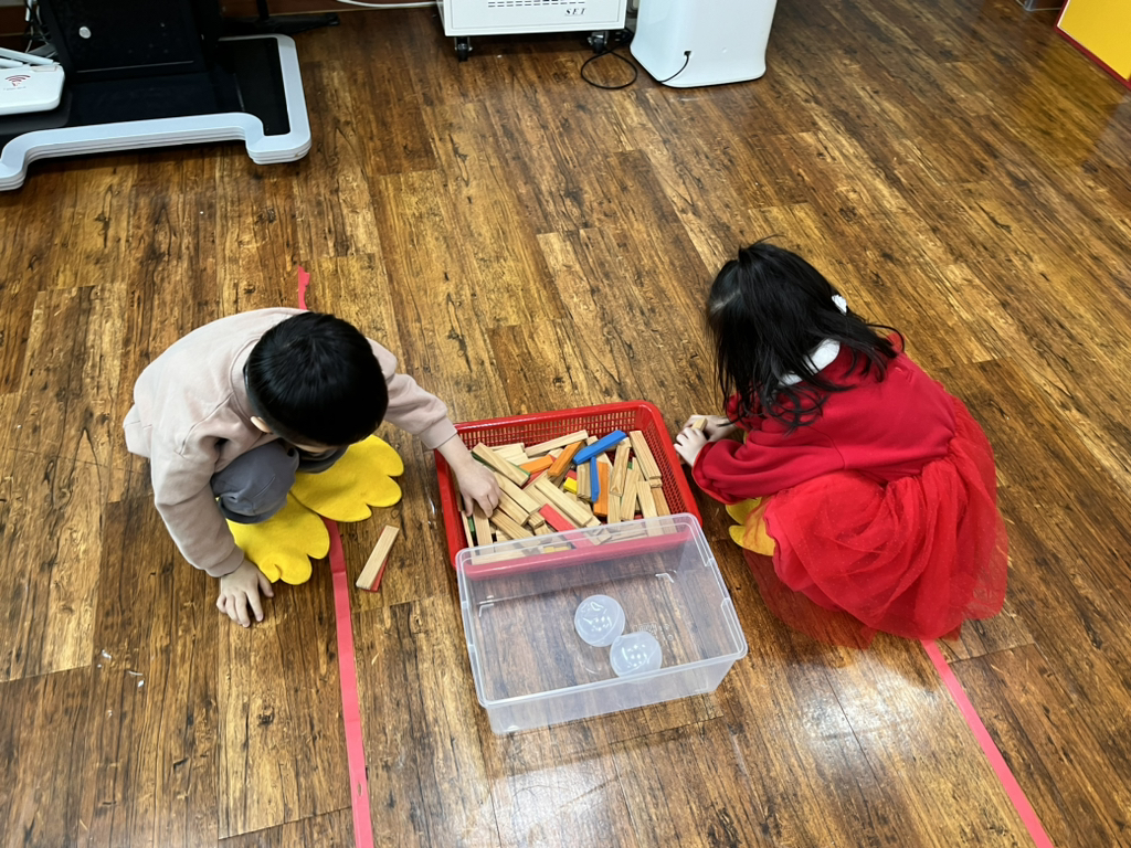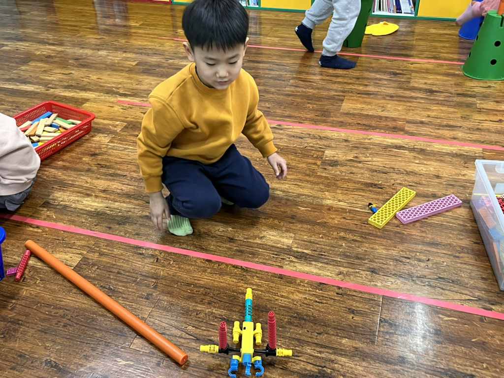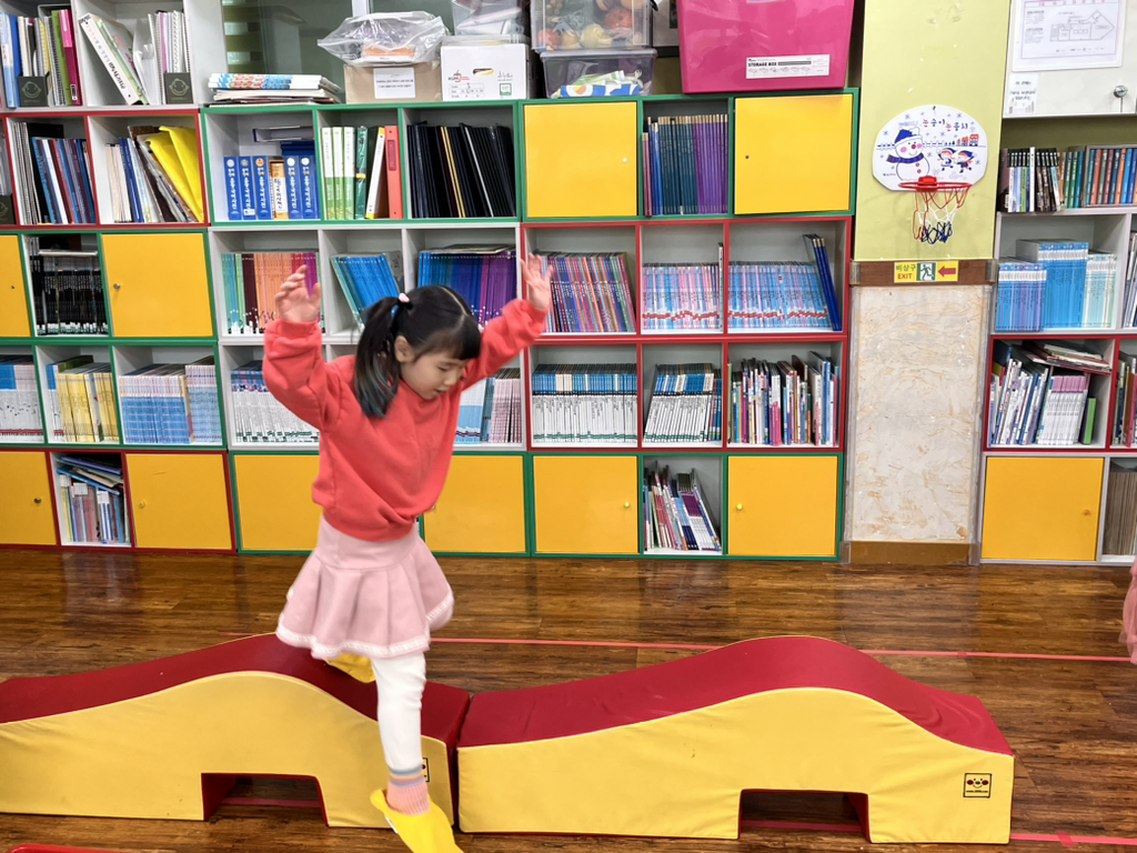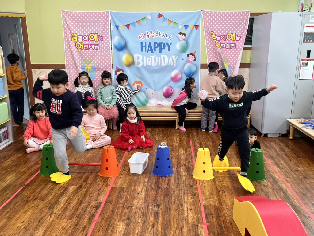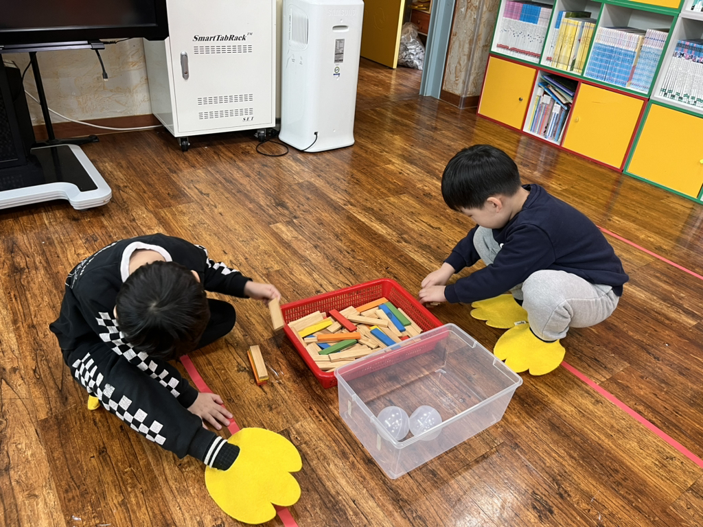 펭귄 발을 신어본 뒤 장애물을 넘어가서 나무 블록을 내 나이 7만큼 쌓아보고 돌아오면 승리 ✌️펭귄 발을 신어서 조금 어려웠지만 재밌다던 슬기들 ^^