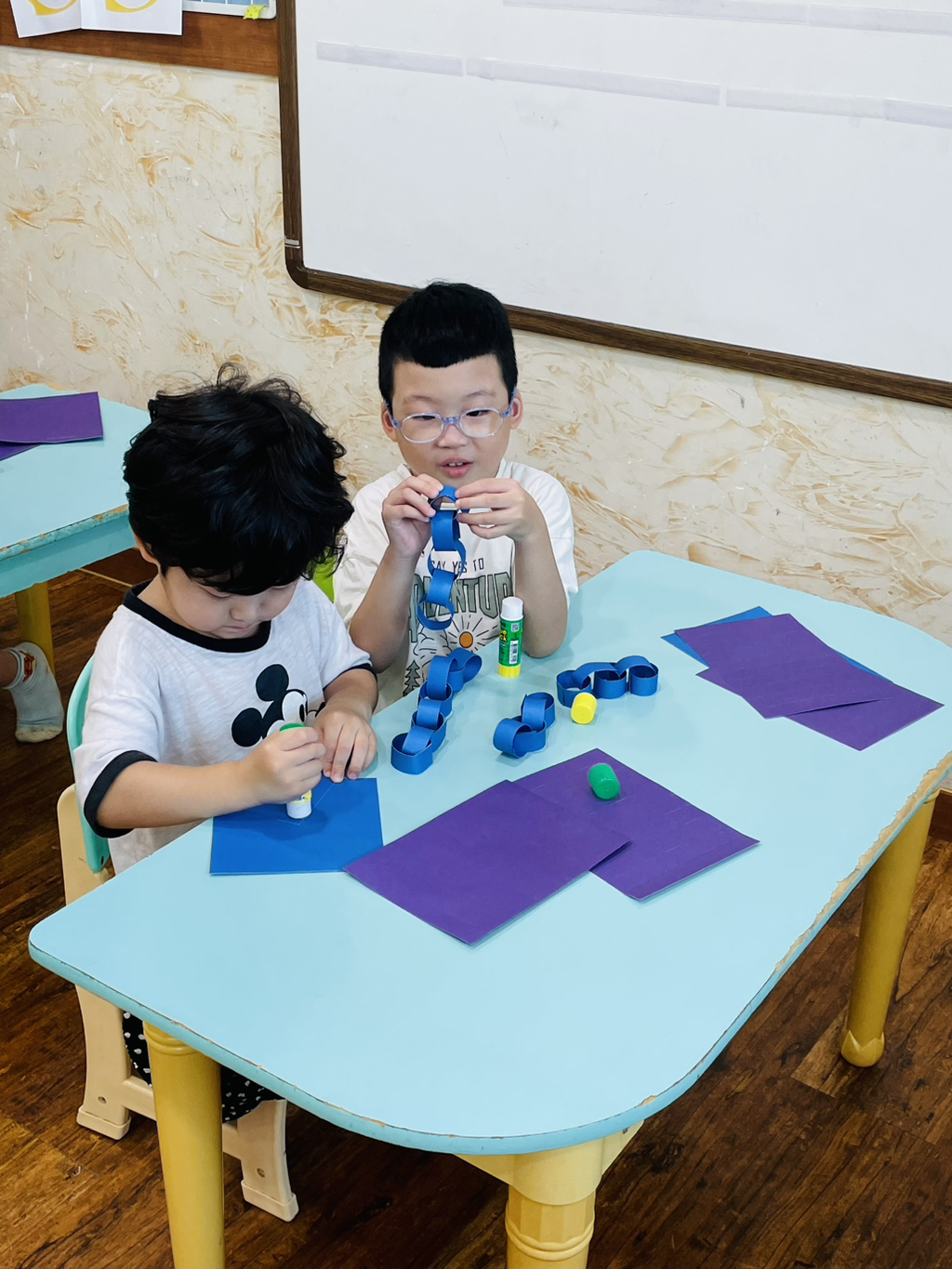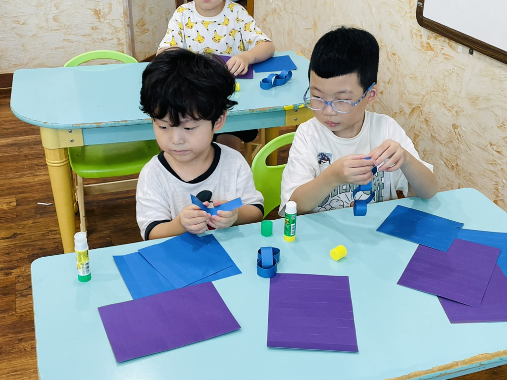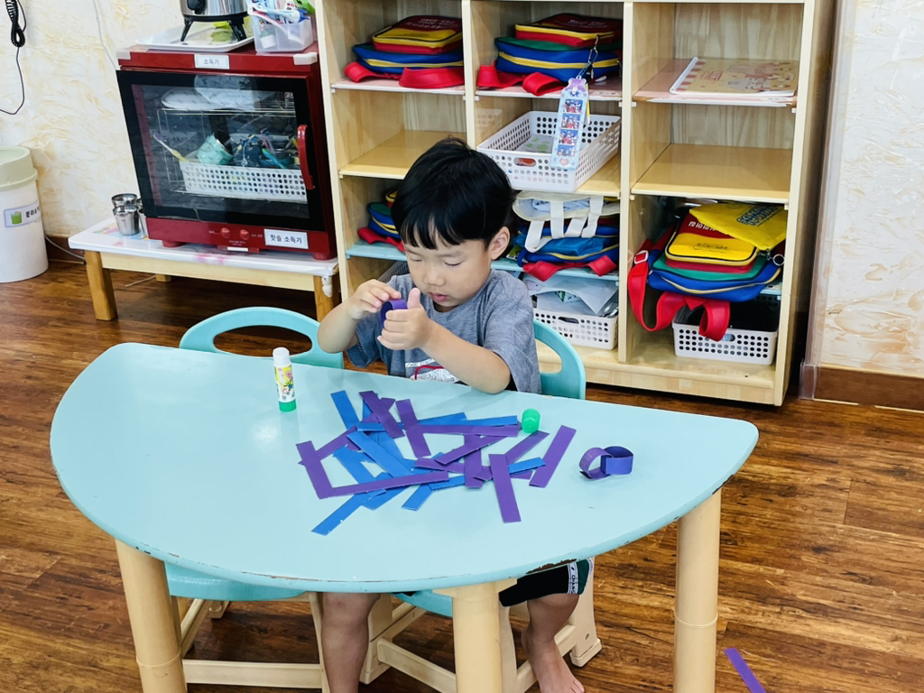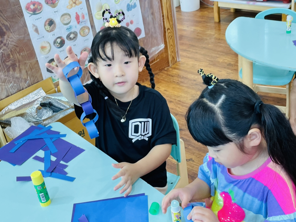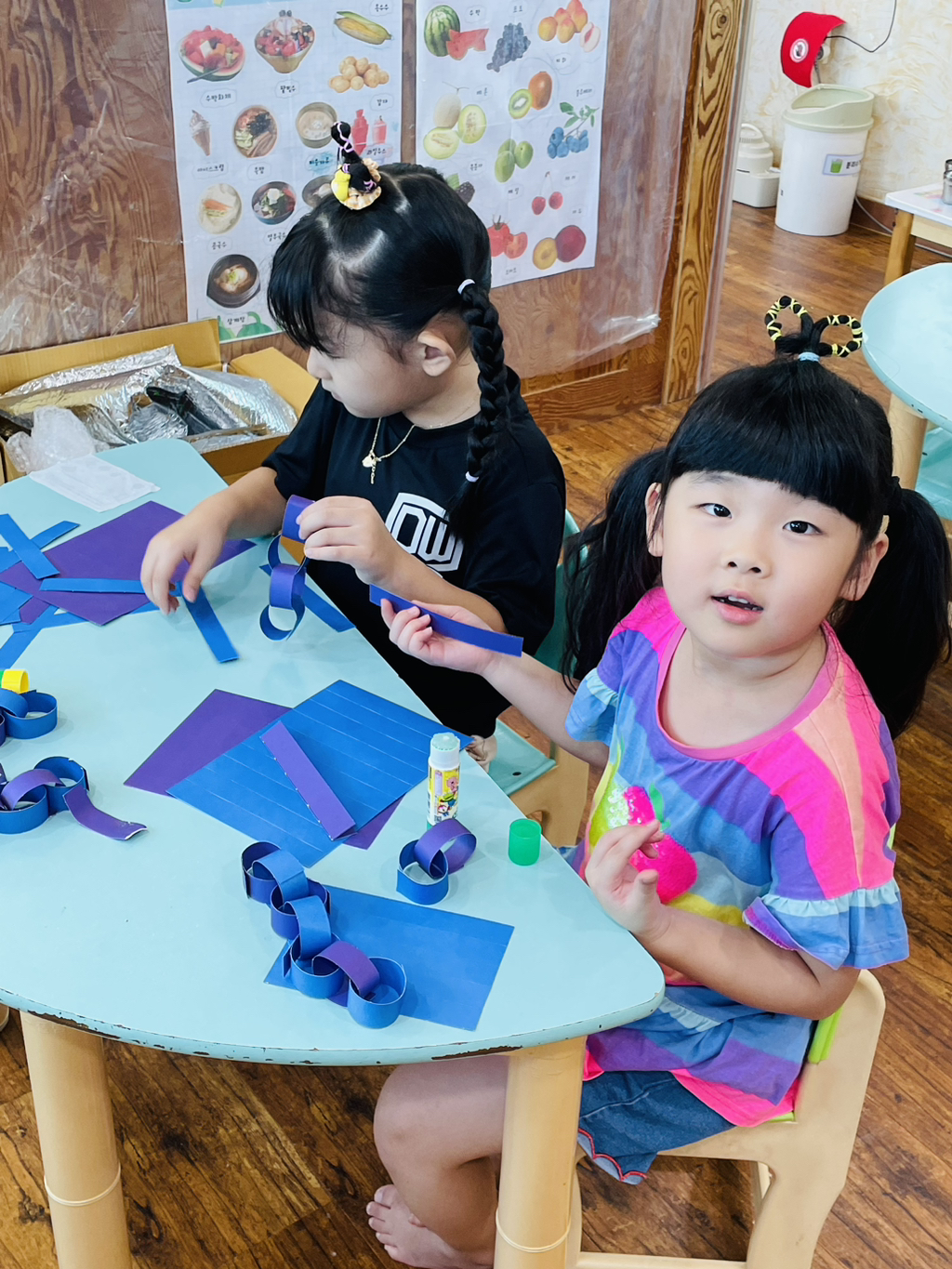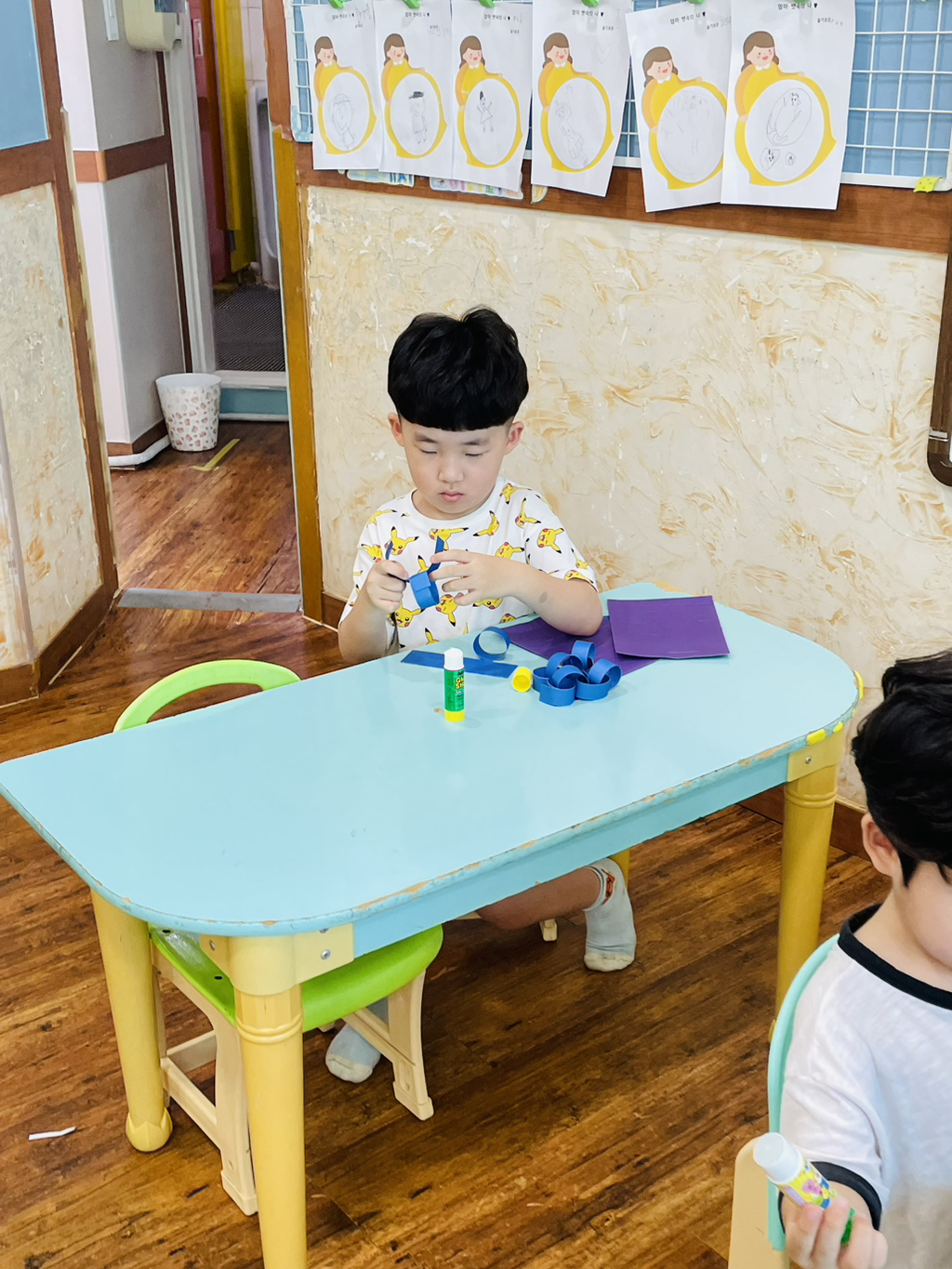 긴 종이를 동글 동글하게 붙여 연결하는게 쉽지 않았지만 차근 차근, 하나씩 하나씩 연결해 해파리의 긴 다리를 만들었어요😀