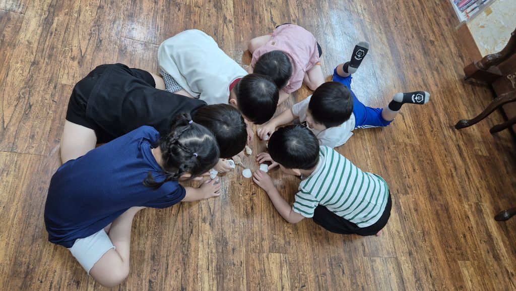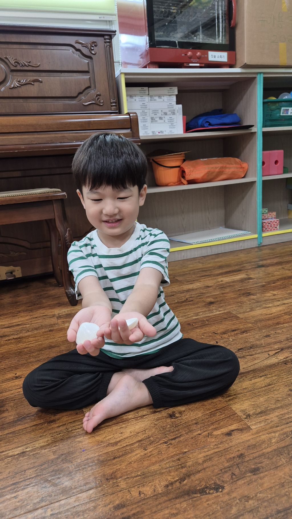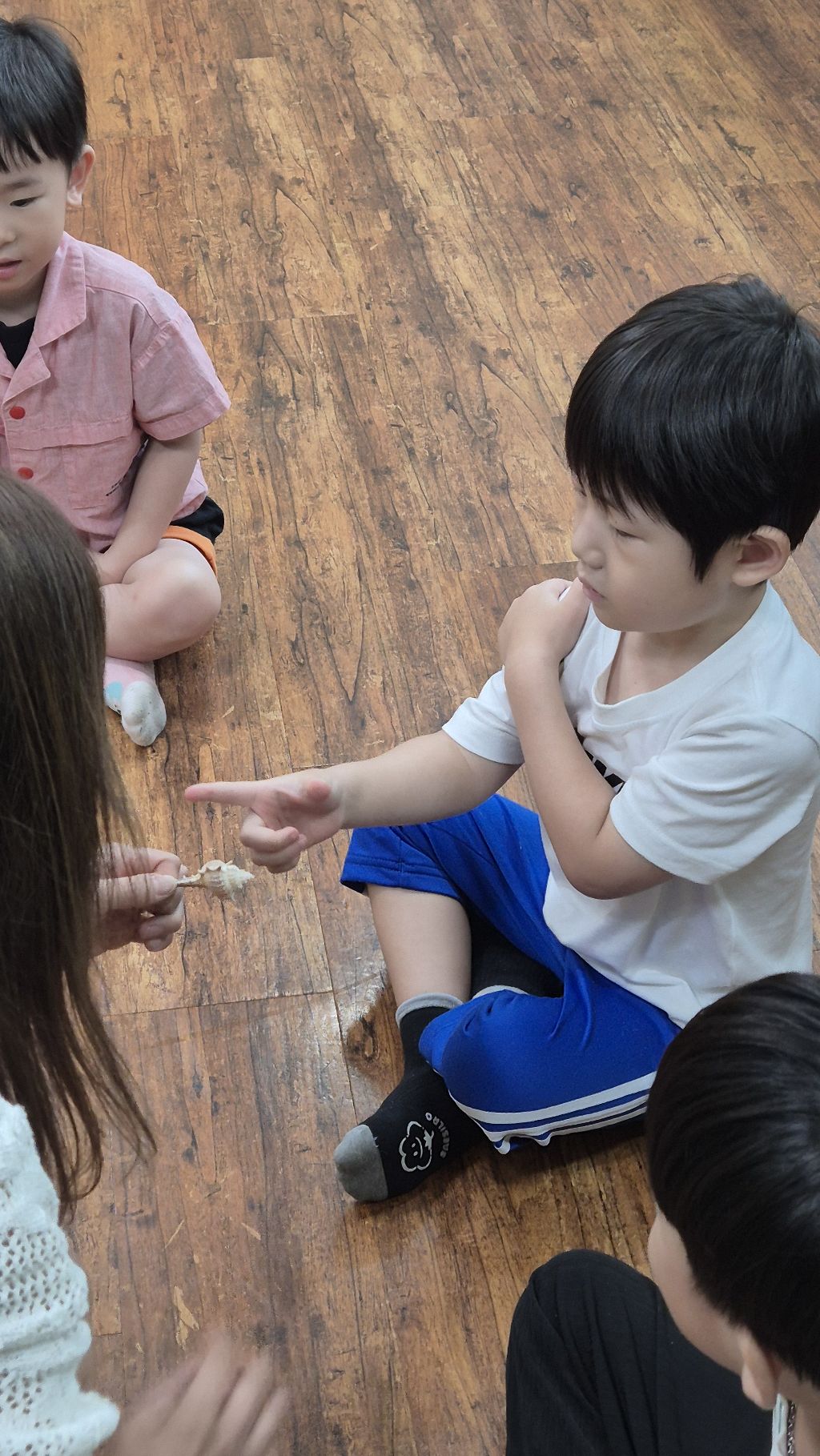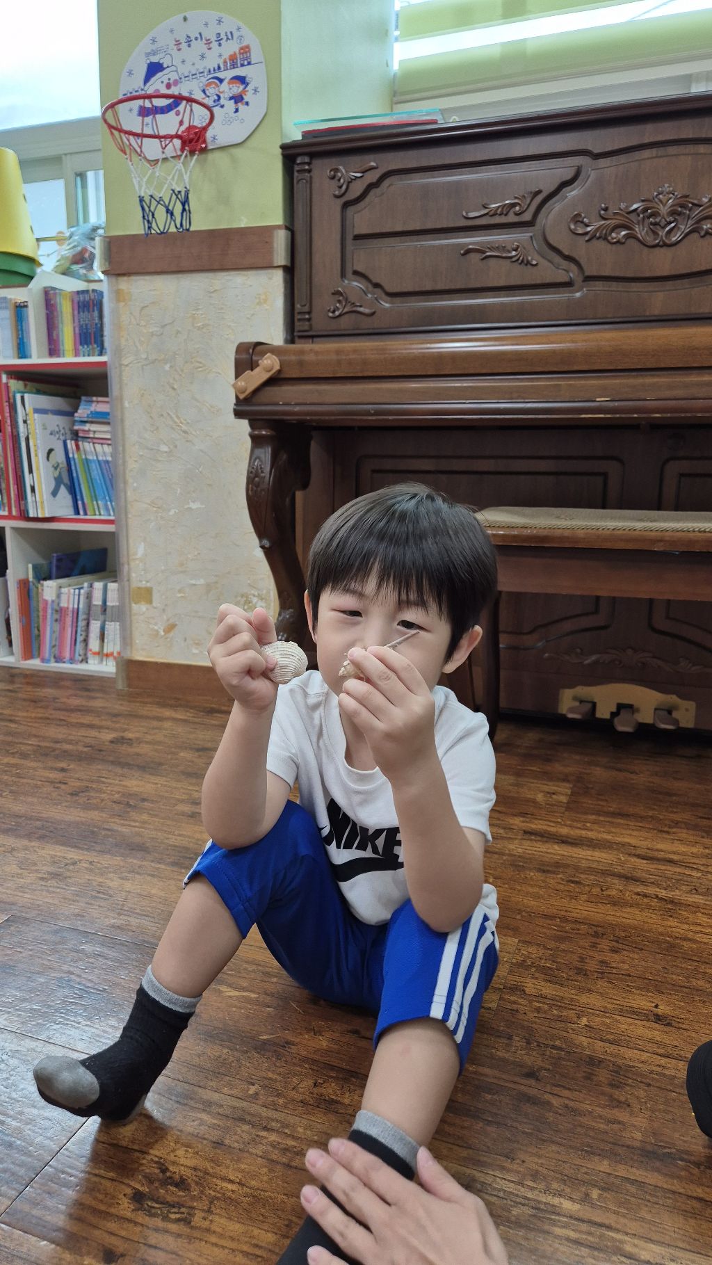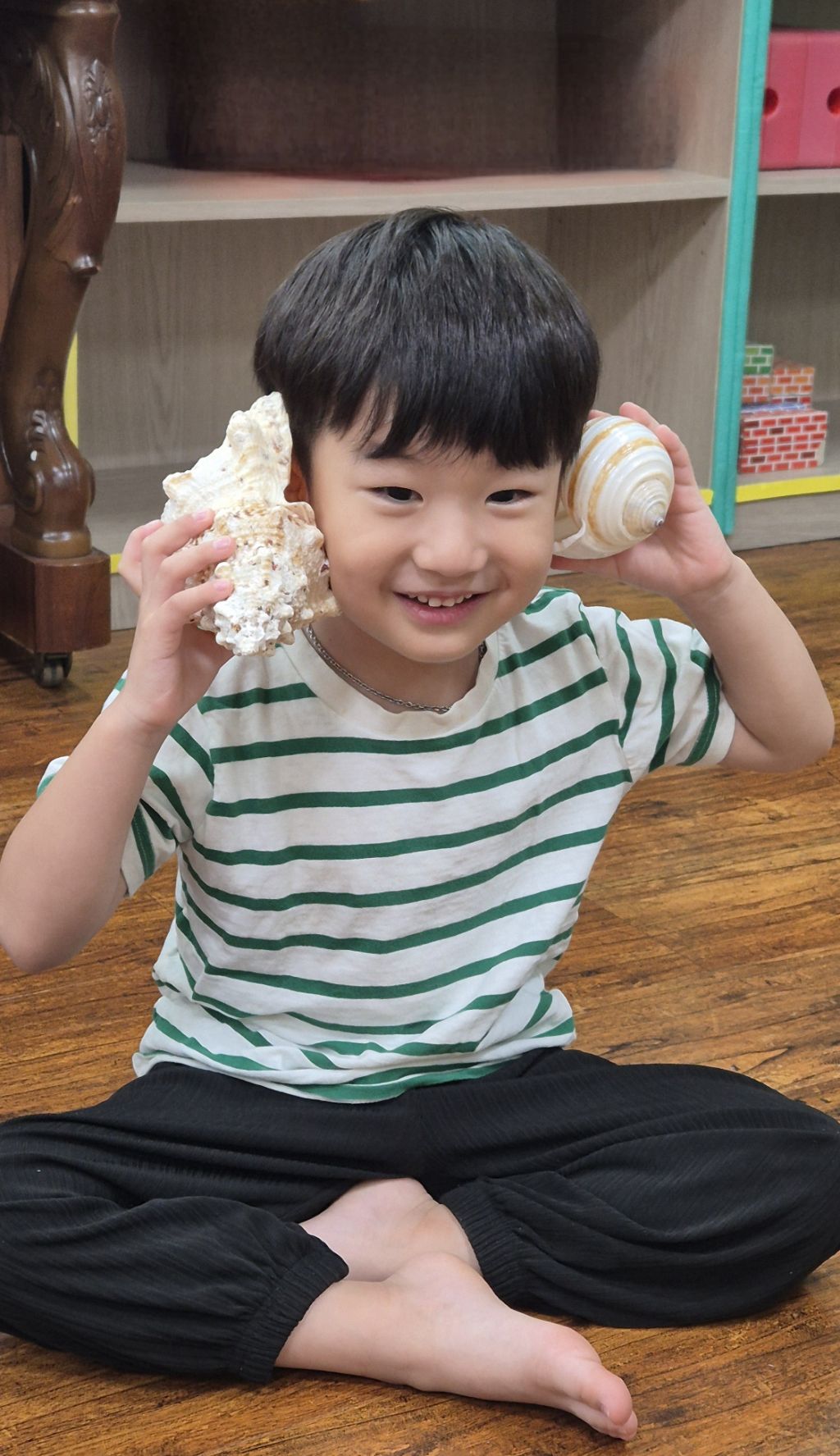 * 오르프 시간에 소라의 소리를 들어보고, 손으로 질감을 만져 보며 탐색하고, 소라 노래를 불러보며 몸으로 표현하고, 소라를 두드리며 소라 노래를 불렀어요. 하와이어로 소라를 '푸우'라고 한대요.