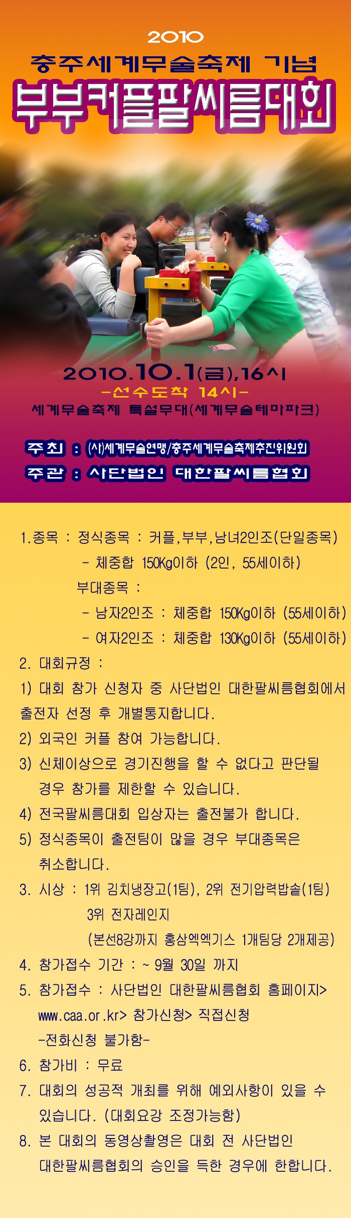 ★2010 충주세계무술축제 기념 부부커플팔씨름대회★ 작성자로하스|작성시간10.09.27|조회수19 목록 댓글 0 글자크기 작게가 글자크기 크게가 다음검색 현재 게시글 추가 기능 열기 북마크 공유하기 신고 센터로 신고 댓글 댓글 0 댓글쓰기 답글쓰기 댓글 리스트