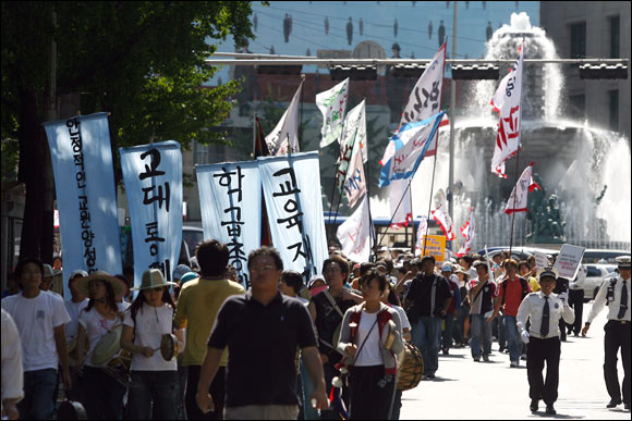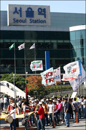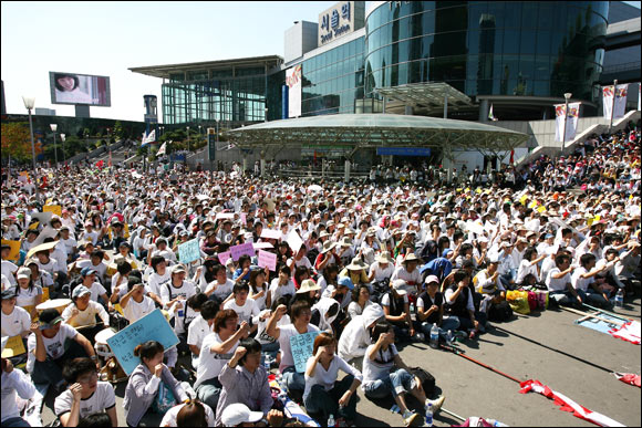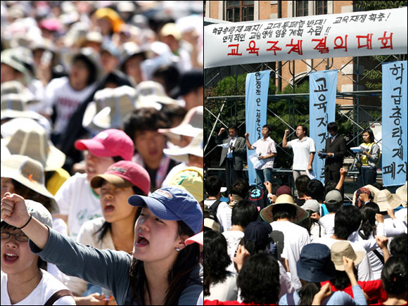최근 제주대와의 통폐합 추진 움직임에 반발하고 있는 제주교대 학생들도 “특수목적대학인 교육대를 일반대학과 통합한다는 것은 정부가 교육정책을 포기하겠다는 것”이라고 주장했다. 아울러 “당장 내년부터 신규 임용교사가 졸업생의 절반에도 못 미칠 전망”이라며 학급총량제 폐지를 강력 촉구했다. 학급 총량제는 지역별로 초·중·고교 학급의 총량을 설정해놓는 것을 말하며 이 제도가 시행될 경우 시·도 교육청은 교육부가 정한 학급 총량에 맞춰 앞으로 5년간 학급수를 줄여나가야 한다. 교대협, 전사련과 함께 1박2일간 수업거부 상경투쟁 22일 수업을 거부하고 대규모 상경투쟁을 벌인 7,500여명의 예비교사들 중 전국교육대학생대표자협의회(교대협) 소속 학생 3,000여명은 22일 밤 서울교대에서 ‘예비교사총궐기’ 전야제를 치른 뒤 23일 오전 11시께 서울역 광장으로 쏟아져 나왔다. 이들은 “학급총량제는 교원감축이 목적이고 교대 통폐합은 국립대 수를 줄여 교육재정을 아끼려는 속셈”이라고 주장한 뒤 종로통 보신각 앞까지 가두행진을 벌였으며, 정리 집회 뒤 자진해산했다. 교대협과 전사련은 지난 11일 교육부 앞 기자회견을 시작으로 10여일만에 수업거부와 대규모 상경투쟁을 벌이는 조직력을 과시했다. 지난봄 교육대투쟁이었던 4.28대학생공동행동 때부터 이미 투쟁의 강도를 높여 왔다. 이번 9.23투쟁에서는 △불안정한 교원양성임용정책을 바꾸고, 교원양성임용의 위기를 극복하기 위해 단결 투쟁한다 △소외된 이들의 교육권을 옹호하고, 교육의 공공성을 실현해 나가기 위해 투쟁한다 △신자유주의 물결에 파괴되고 있는 한국교육을 바꾸기 위해 함께한다고 선언했다.