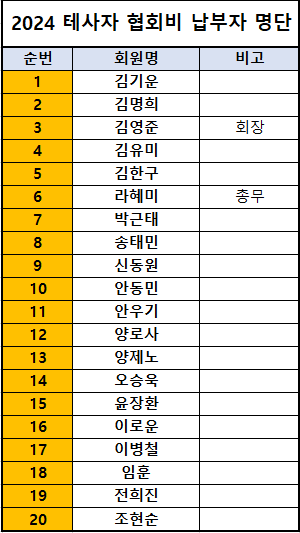 2024년 테사자 클럽 협회비 납부자 명단 작성자라혜미|작성시간24.05.20|조회수260 목록 댓글 0 글자크기 작게가 글자크기 크게가 2024 테사자 협회비 납부자 명단.xlsx10.05KB 첨부파일첨부된 파일이 2개 있습니다. png 파일 20240520_135936.png 다운로드 xlsx 파일 2024 테사자 협회비 납부자 명단.xlsx 다운로드 다음검색 현재 게시글 추가 기능 열기 북마크 공유하기 신고 센터로 신고 댓글 댓글 0 댓글쓰기 답글쓰기 댓글 리스트