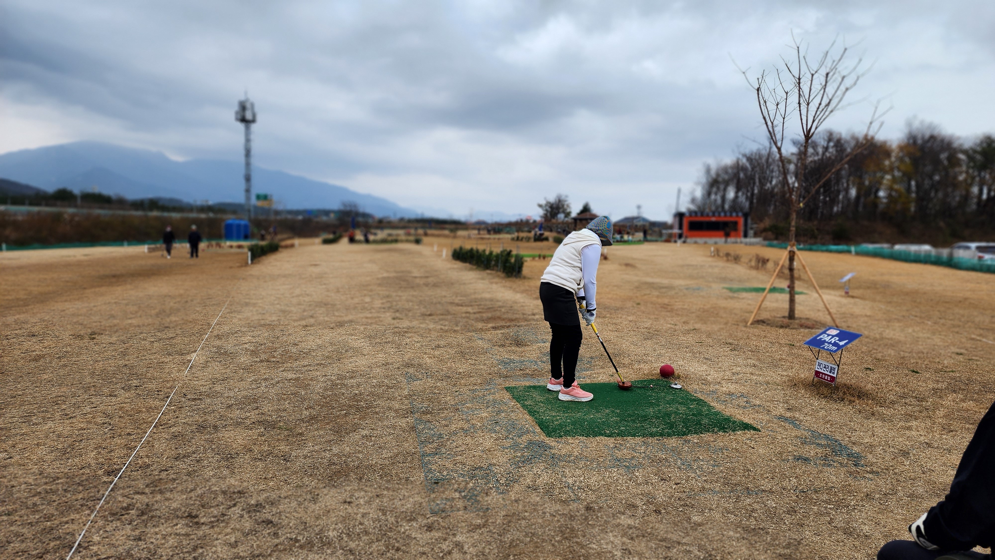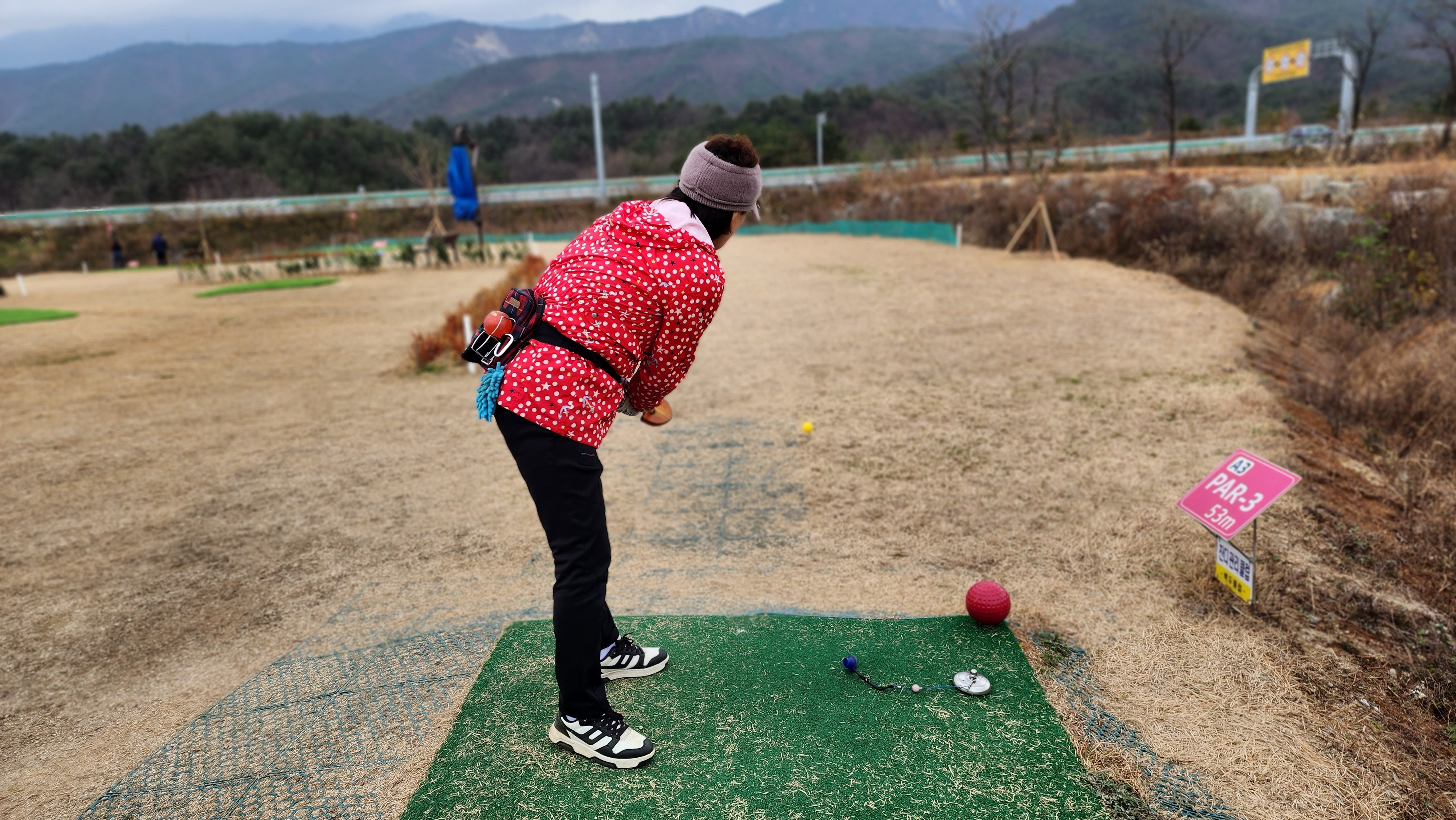 빨간상의 여자분 코스로 공을 치면 1타로 그린밑 도달
