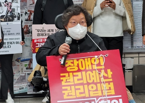 서울장애인자립생활센터협의회 이형숙 회장은 “윤석열 대통령의 시장연설을 보면 장애인관련 복지 이야기를 했는데, 중요한 것은 장애인권리를 보장하겠다고 했지만 실제로 정부예산안에 제대로 반영돼 있지 않다”고 꼬집었다.