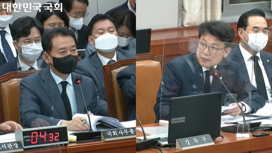 지난 11월 2일 열린 국회 사무처 국정감사에서 더불어민주당 진성준 의원(오른쪽)이 이광재 국회사무총장(왼쪽)에게 질의하고 있다. ⓒ국회방송