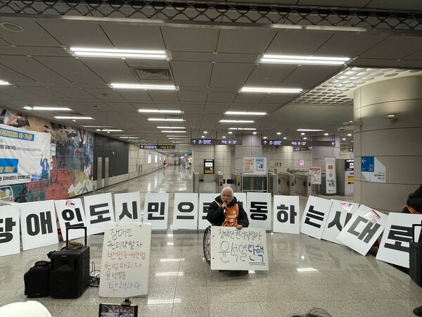 전국장애인차별철폐연대(전장연)가 4일 국회의사당역 안 농성장에서 어젯밤 윤석열 대통령의 비상계엄 선포를 두고 ‘반헌법·반민주주적인 행위’라고 비판하며 즉각 탄핵해야 한다고 외쳤다.ⓒ전국장애인차별철폐연대