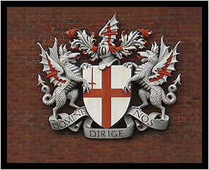 시티 오브 런던(City of London)의 공식 문장을 정면에서 바라본 모습으로 많은 건물에서 문장을 볼수 있습니다.가운데 방패 안에 있는 흰 바탕에 레드 크로스는 시티 오브 런던의 'flag' 모양이기도 합니다.