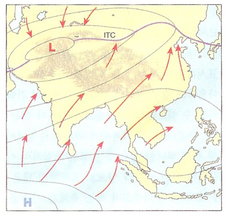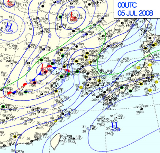 여름에 들어서면 북태평양 고기압의 중심부가 북상하기 시작한다. 그림처럼 계절풍도 남서기류가 우리나라로 유입된다.