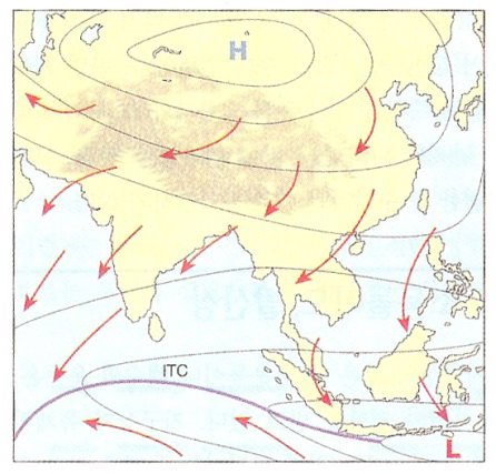 겨울에는 시베리아 고기압의 영향을 받게 된다. 매우 차갑고 건조한 공기가 특징이다. 그럼처럼 북서계절풍이 강하게 분다.
