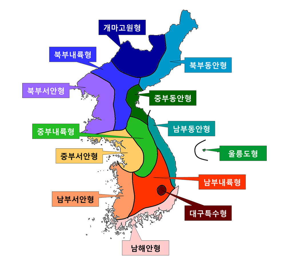 우리나라의 기후구는 Köppen 기후구로는 2지역으로 구분된다. 온난습윤 기후구(Cf)와 한랭동계 소우기후구(Dw)다. 그러나 두 개의 큰 기후구로 구분하더라도 지형 등의 영향으로 같은 기후구 안에서도 상이한 기후가 나타난다. 따라서 두 개의 대기후구를 몇 개의 소기후구로 나눌 수 있다. 남북의 기온특성에 따라 남부, 중부, 북부의 3개 기후형으로 나눌 수 있다. 태백산맥과 낭림산맥을 경계로 하여 동서로 양분할 수 있다. 계절풍과 해안거리에 따라 서안형, 내륙형, 동안형 등으로 나눌 수도 있다. 따라서 井자 형으로 구분되는 총 13개의 기후형으로 나눌 수 있다.