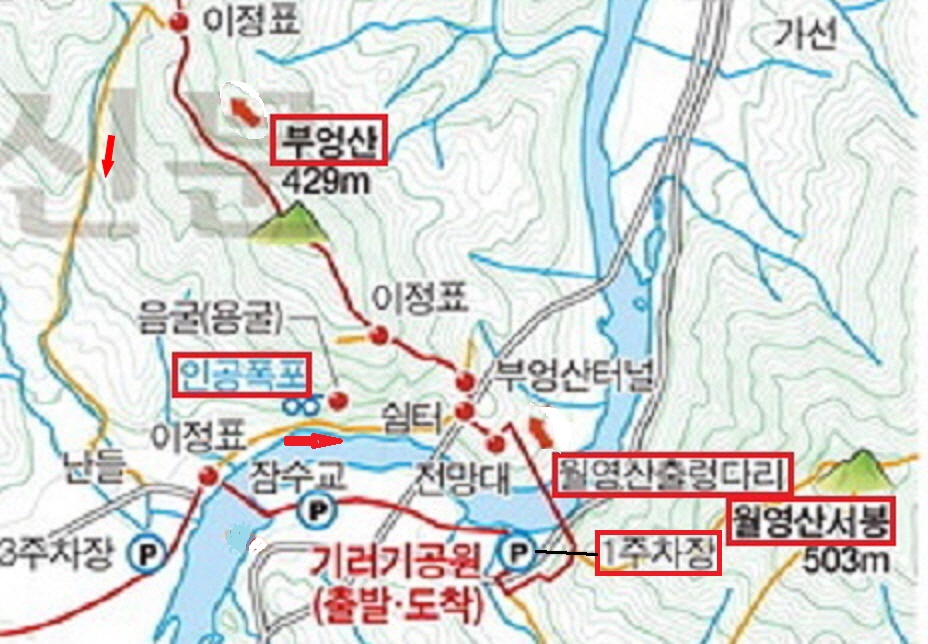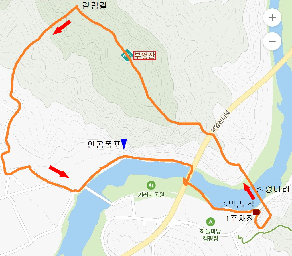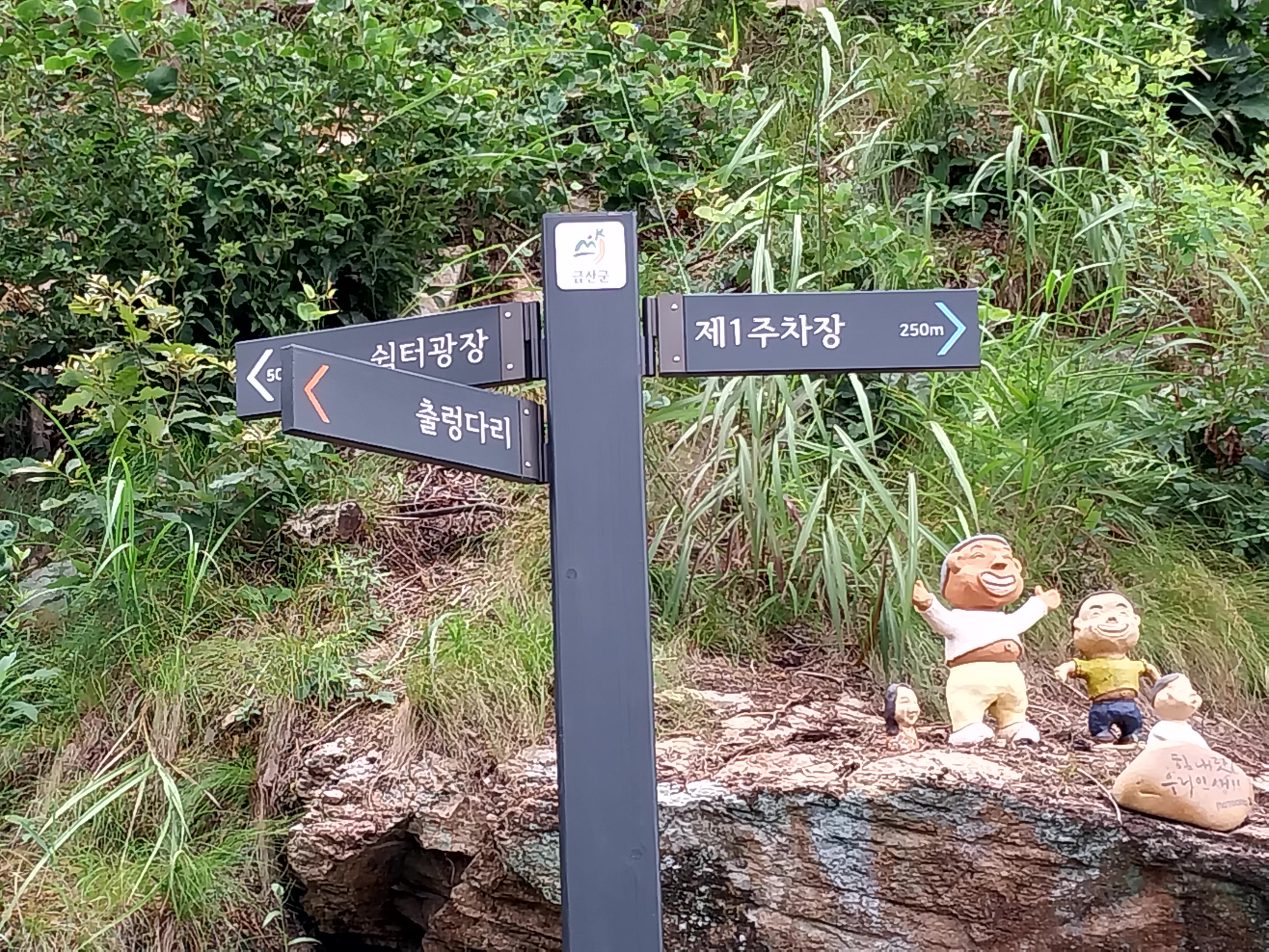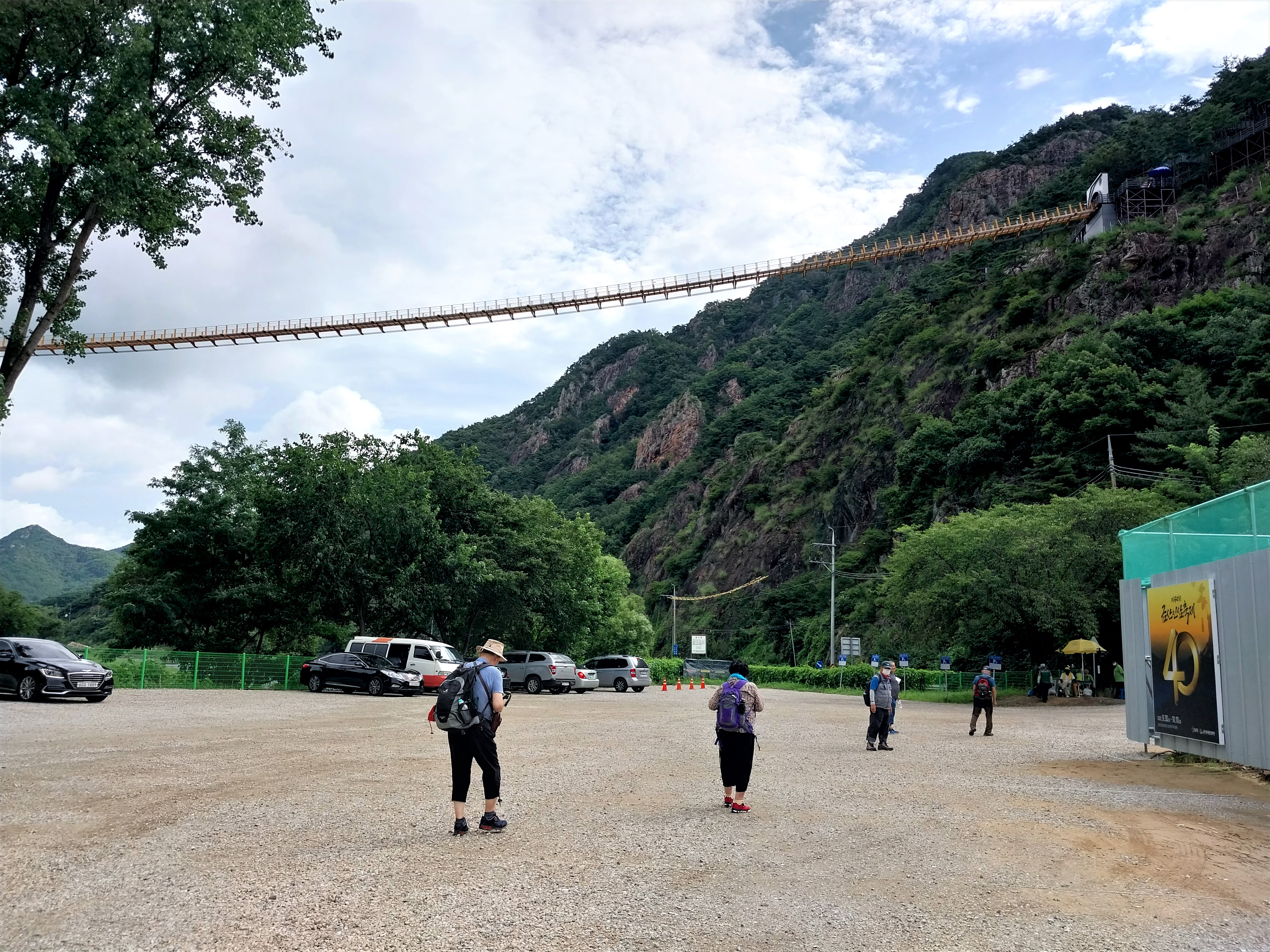 ▲출렁다리 아래 제1주차장에서 버스를 내려 출렁다리를 보고 월영산으로 갈 사람은 월영산으로 가고 부엉산으로 갈 사람은 부엉산으로 가고 그냥 계곡으로 내려갈 사람은 내려갑니다.