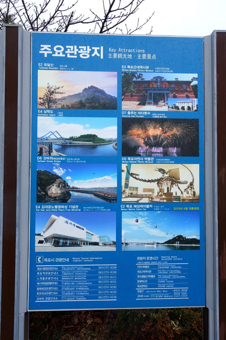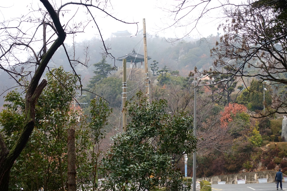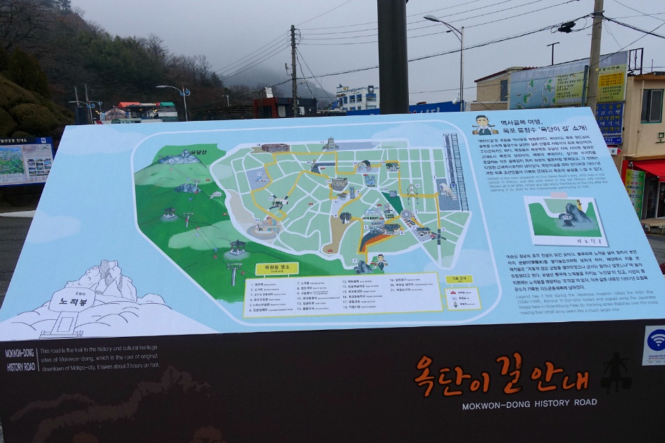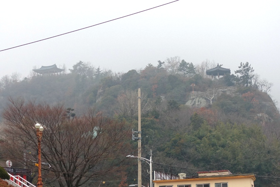 식당 앞에 나와서 보니 앞에 우측에 보이는 것이 노적봉이고 좌측에 구름안개가 덮힌 산이 유달산이라고 하네요. 다행히 비는 거의 그쳤습니다.