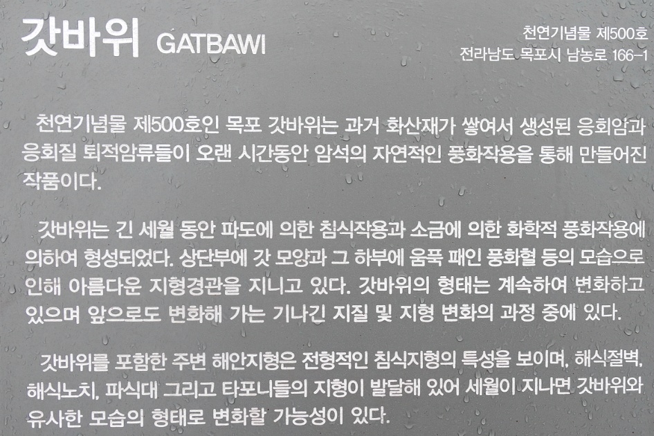 19일 목포의 유달산을 가는 날인데 예보대로 아침부터 비가 내리고 참석 회원수도 적어서 좀 흥이 덜 나지만 예정대로 갑니다. 목포에 도착 했을 때도 약간씩 비가 내려서 해안의 갓바위와 그 인근을 보고 점심식사를 한 후에 유달산으로 가기로 합니다.