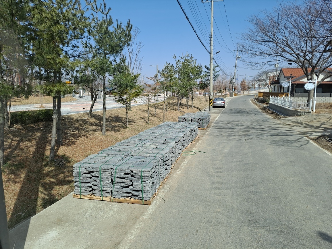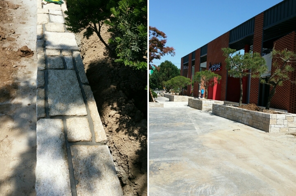 경계석, 벽돌, 대리석, 자갈, 잔디 등