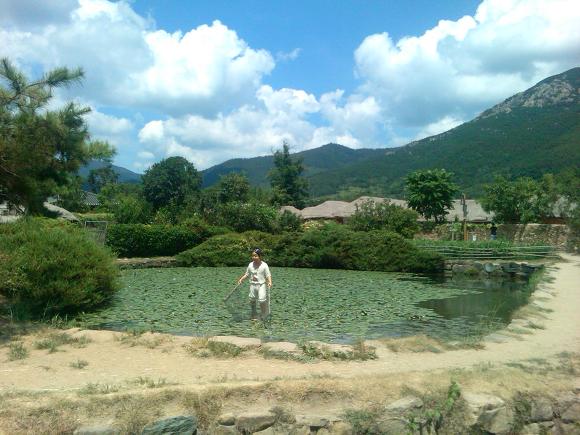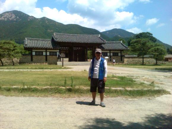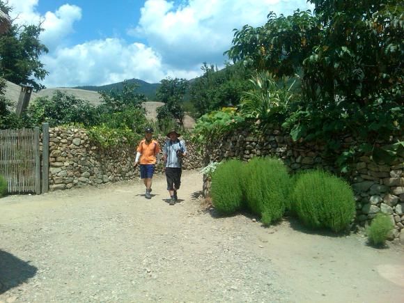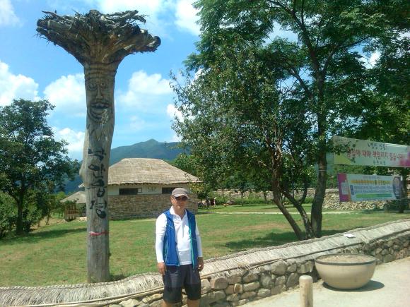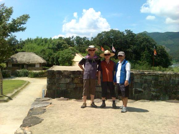 한 낮의 초가집 돌담은 정겹게 우리들의 발길을 이끌고 있다, 돌담위의 호박 넝쿨도 뜨거운 태양빛에 힘을 잃어가고 초가집 마당의 잔디는 타 들어 가지만 한가롭고 평화스런 초가 마을은 우리의 마음의 고향이다. 지금 중년의 꽃 할배들이 마음의 고향에서 수많은 세월을 살아온 아련한 마음을 가슴 한 구석에서 짠~ 한 느낌이 묻어 나오는 순간이다. 나는 이 순간이 좋다.