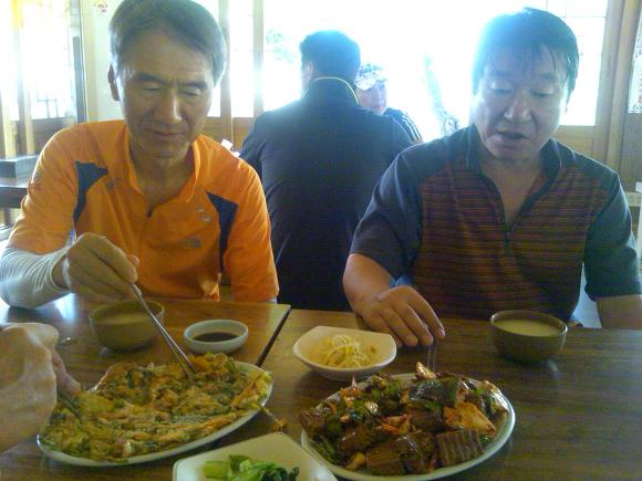민속 장터에는 국밥, 산채 비빔밥 등 여러 토속 음식을 팔고 있었는데 우리는 이 고장에서 아주 유명하다는 벌교꼬막정식을 먹기 위하여 초벌(?)로 파전과 묵을 시키고 동동주를 곁 드렸다.