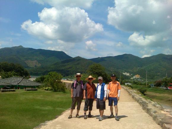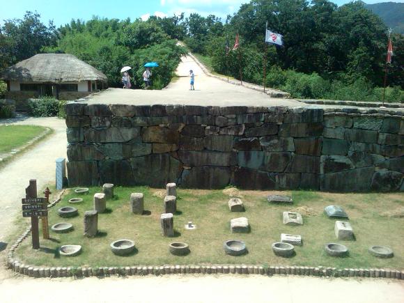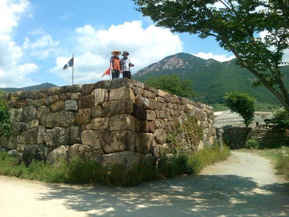 앞쪽이 출입문인 동문이고 동문에서 대칭되는 곳에 서문이 있고 남쪽편 에는 초가마을이다, 그리고 우리가 돌아 본 성곽 위는 북측이다.