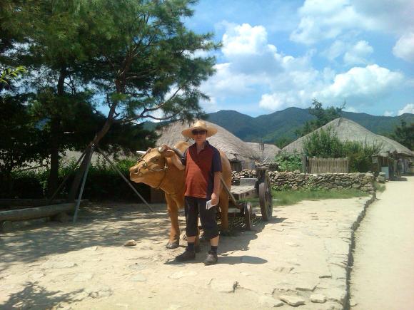 < 시골에서 달구지를 끌고 있는 J, ( 소는 모형이다 )>