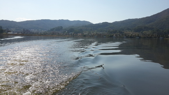 < 좌대를 떠나며 보트가 물살을 가르는 풍경 >