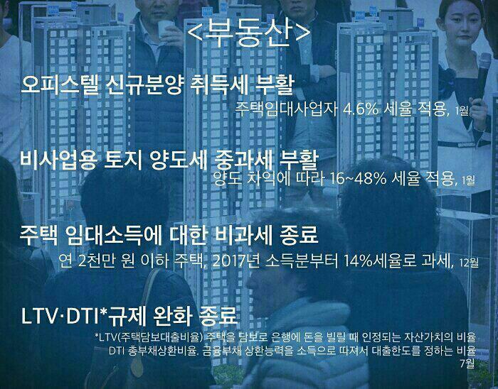 그 외 부동산 경기 활성화를 위해 LTV(담보대출인정비율), DTI(총부채상환비율) 한시적 완화조치의 추가연장 유무가 7월에 결정이 되며 10년 이상 부모님을 모시면 상속받는 집값의 5억 원까지는 상속세를 80% 면제해주고, 인터넷을 통한 부동산 거래.신고는 내년 초 시범운영을 해서 2017년 시행이 된다.