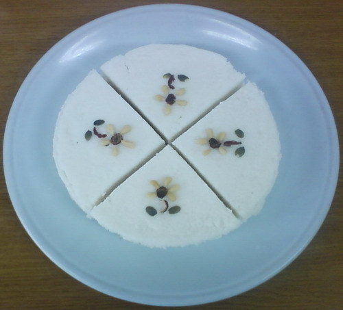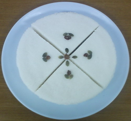 3) 접시나 쟁반을 위에 얹어 뒤집어 놓고 시루(또는 딤섬)를 살살 들어 올려 주면 떡이 빠져 나옵니다. 다른 접시나 쟁반을 이용하여 다시 뒤집어 원래대로 놓습니다. 그리고, 떡이 떨어질 때 테두리 부분이 매끄럽도록 하기 위하여 제빵에서 사용하는 실리콘 페이퍼를 사용하기도 합니다.