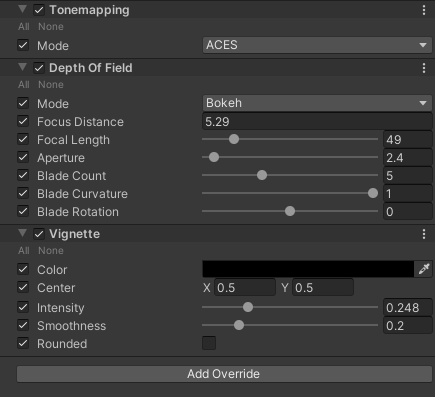 Tonemapping을 먼저 켜주고 시작합니다. Mode는 ACES로 바꿔줍니다.