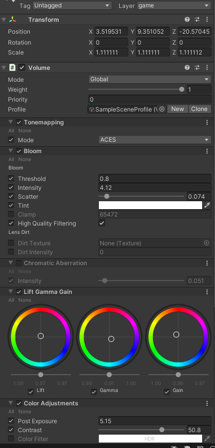 블룸 - 빛나는 부분이 많기 때문에 추가해줬습니다. 수치는 화면을 봐가며 조정했습니다.