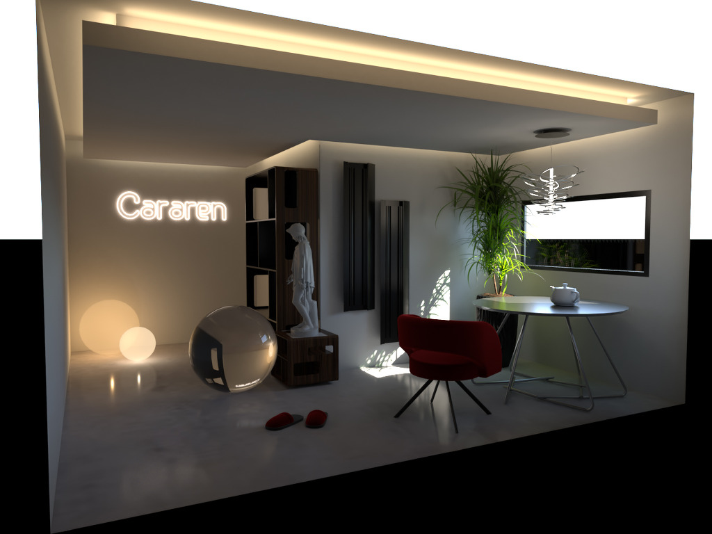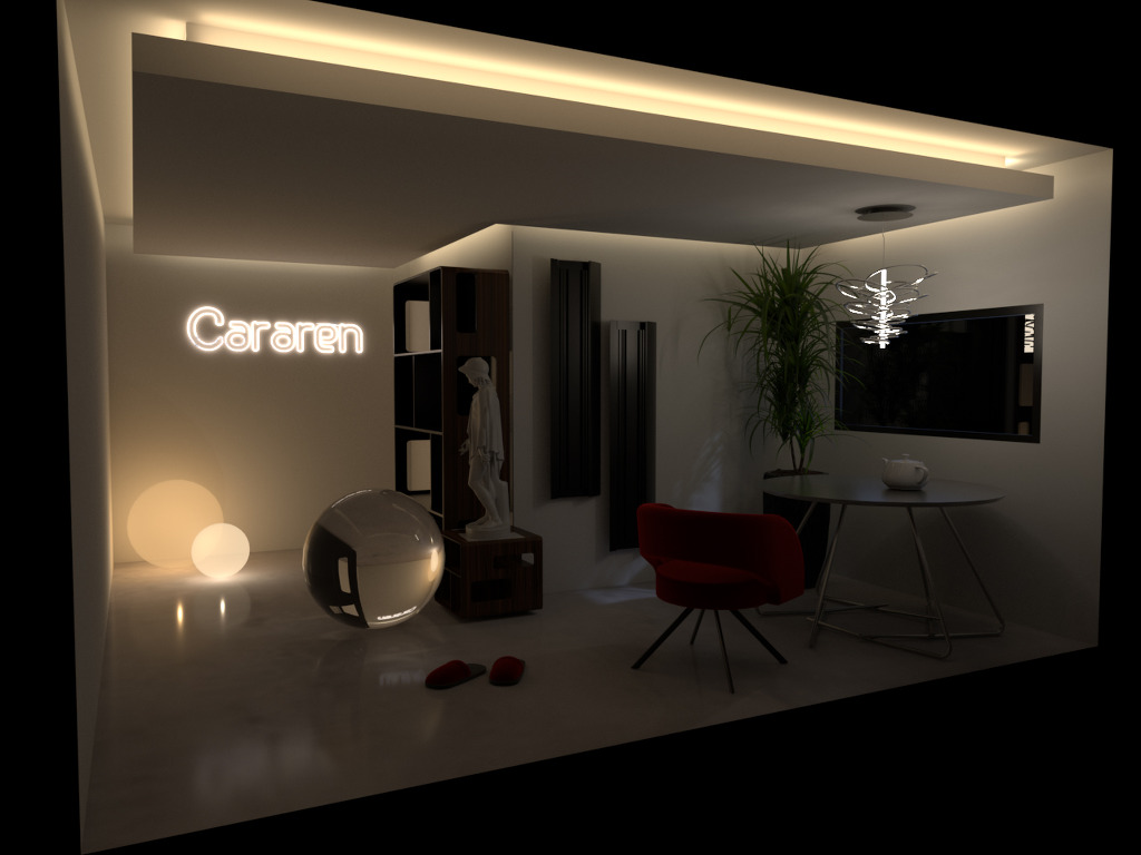 주전자가 놓여있는 테이블에 비치는 프레넬이라던가, 바닥에 너무 과하지 않게 은은하게 비치는 대리석 질감, 거기에 확실히 이렇게 설계했음이 당연시되는 천장의 간접조명과 멋진 공 무드등이 모두 아름답게 어울리면서 어느것 하나 불협화음을 내지 않습니다. IES 라이트를 쓰지 않은건 신의 한수 같아요. 이쪽이 훨씬 더 낫네요.