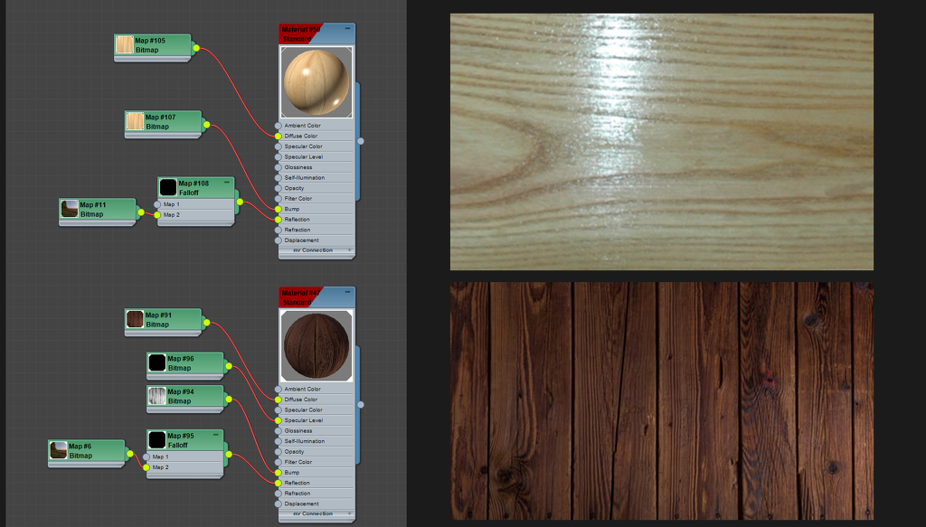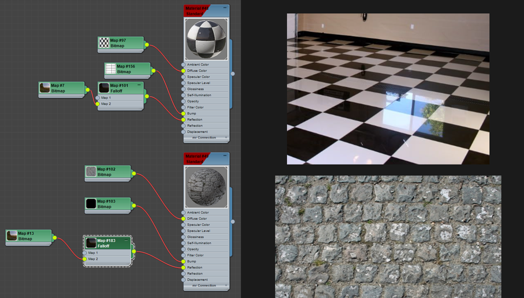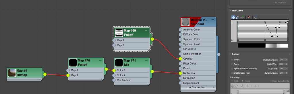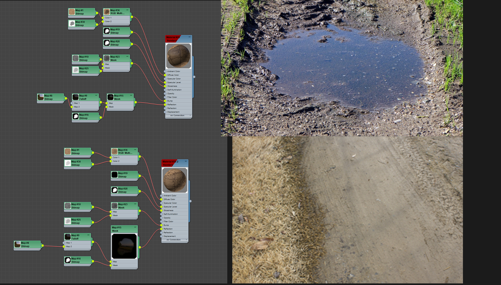 그 뒤 젖은 영역에는 물이 있으니까 리플렉션을 비교적 강하게 주었습니다. 그러기 위해서 맥스에서 mask 기능을 써보았습니다.