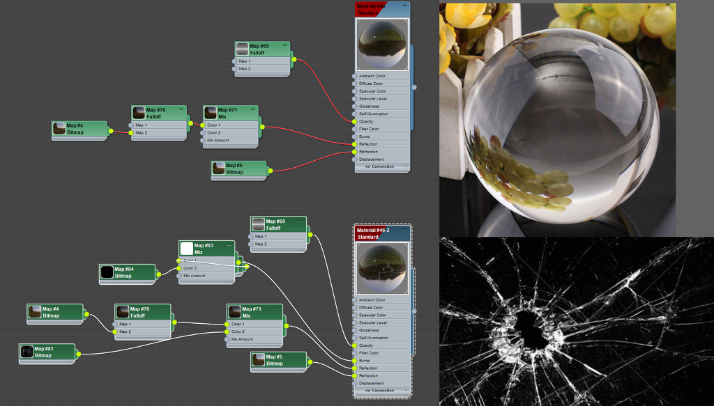 이부분은 refract 때문에 디퓨즈나 다른것들로 해결할 수 없었어서, reflect 부분에다가 mix를 이용하여 환경이 반사되는 것과 섞어주었습니다. 물론 깨진부분은 어느각도에서나 보이기때문에 falloff는 적용하지 않고, 환경에 falloff를 적용한 이후에 섞어주었습니다.
