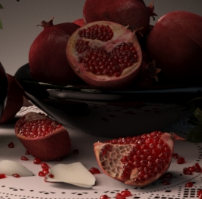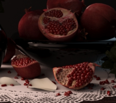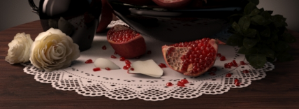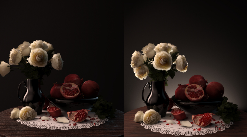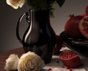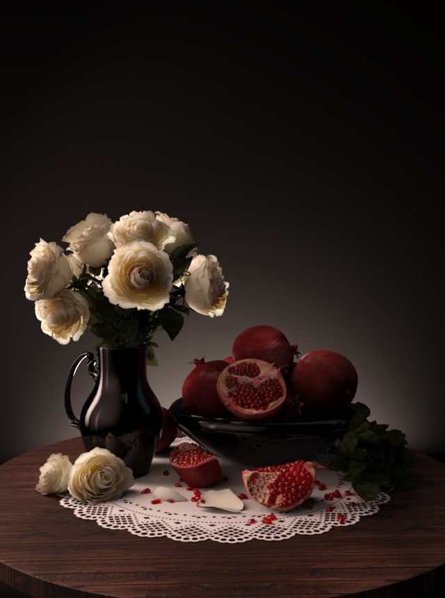 꽃병과 석류 그릇에서 예쁜 스펙큘러를 표현하고 싶었기때문에, 빛을 배치할 때 그 부분도 많은 신경을 썼습니다.