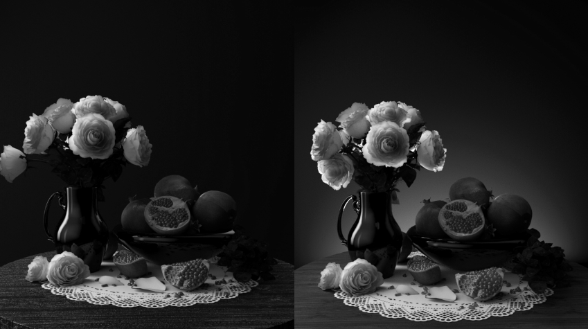 각각의 물체는 명도 차이로 인해 분리되어 보입니다. 그 명도는 흑백 이미지로 확인할 수 있고요.