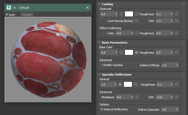 석류 머테리얼입니다. 디퓨즈 맵, 스펙큘러 맵을 사용했습니다.