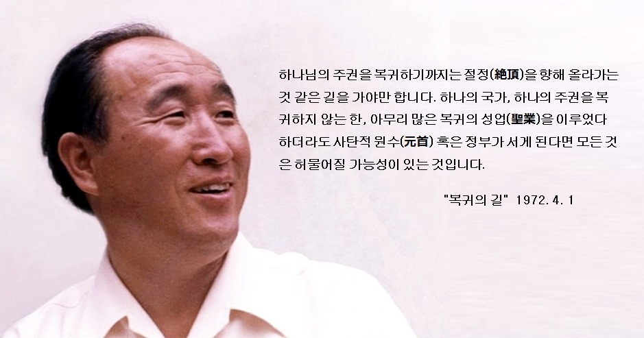 그 국가는 그 밖의 모든 사탄 주권으로부터 승리하여 외적 세계의 중심이 될 것입니다. 한 나라가 하나님의 뜻을 중심으로 복귀되면 그것은 둘로 확대되고 다시 세 개, 네 개, 결국 전세계를 다 덮기까지 확대하여 갈 것입니다. 그래서 그 나라에 속하는 모든 국민은 누구나 자동적으로 복귀되고 말 것입니다. 그 하나의 하나님의 주권을 복귀하기까지는 절정(絶頂)을 향해 올라가는 것 같은 길을 가야만 합니다. 하나의 국가, 하나의 주권을 복귀하지 않는 한, 아무리 많은 복귀의 성업(聖業)을 이루었다 하더라도 사탄적 원수(元首) 혹은 정부가 서게 된다면 모든 것은 허물어질 가능성이 있는 것입니다.