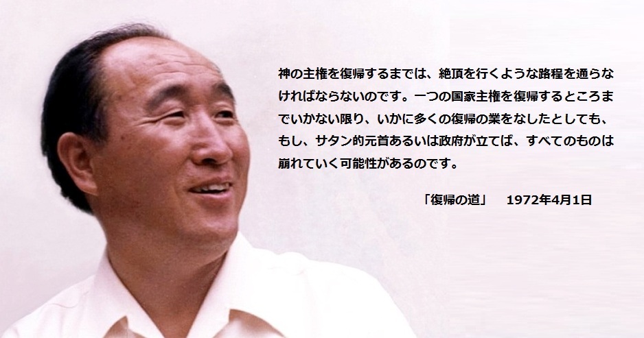その国家は、他のあらゆるサタンの主権に打ち勝って、外的世界の中心となるでしょう。ひとたび、天的国家が復帰されるならば、それは二つの主権へと拡大し、さらに三つ、四つと、やがて全世界を覆い尽くすまでに拡大していくでしょう。そして、その天的国家に属する民族は、自動的に何もかも一緒に復帰してしまうでしょう。その一つの神の主権を復帰するまでは、絶頂を行くような路程を通らなければならないのです。一つの国家主権を復帰するところまでいかない限り、いかに多くの復帰の業をなしたとしても、もし、サタン的元首あるいは政府が立てば、すべてのものは崩れていく可能性があるのです。