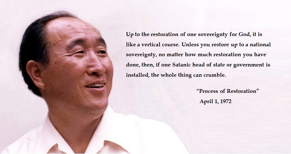 This will be the center of the outside world, which will be superior to all other Satanic sovereignties. This is Satanic world (l). Once the heavenly nation is restored, then it will expand to two sovereignties, three, four until we cover the entire world. Then, the nation that belongs to that heavenly state will automatically restore lock, stock and barrel the whole thing together. Up to the restoration of one sovereignty for God, it is like a vertical course. Unless you restore up to a national sovereignty, no matter how much restoration you have done, then, if one Satanic head of state or government is installed, the whole thing can crumble. Therefore, it is our most urgent mission to restore one sovereignty.