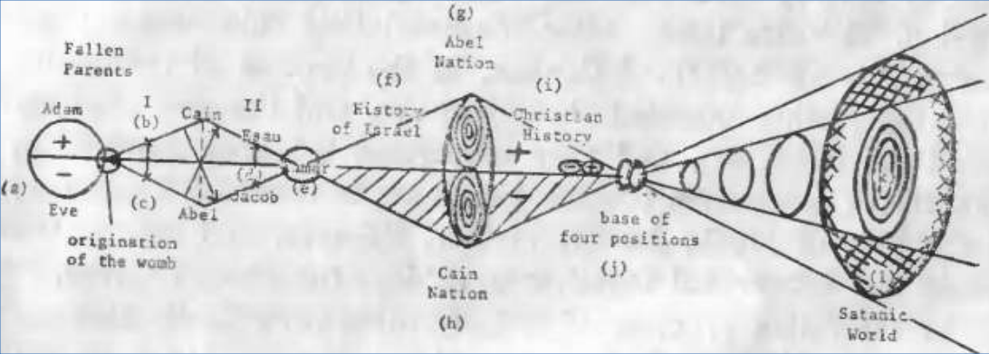 This figure represents True Parents (a) represents Adam and Eve, the fallen parents. Up to here the upper position (b), Cain came; in the lower position (c), Abel the two sons of Adam and Eve.