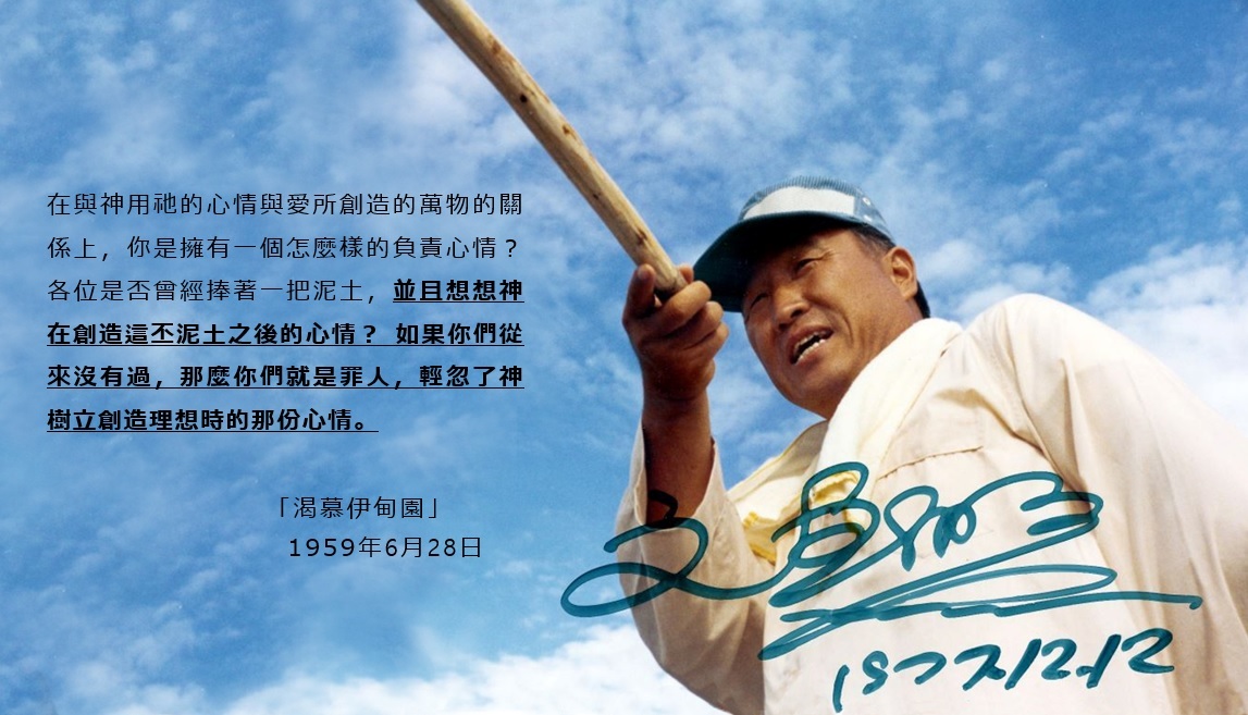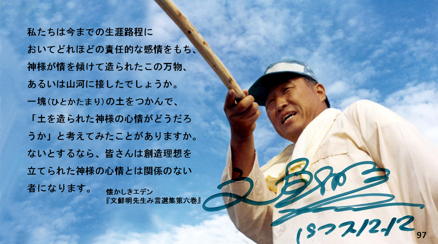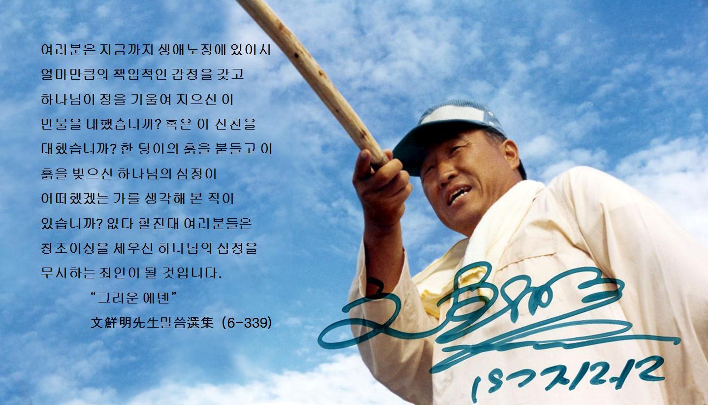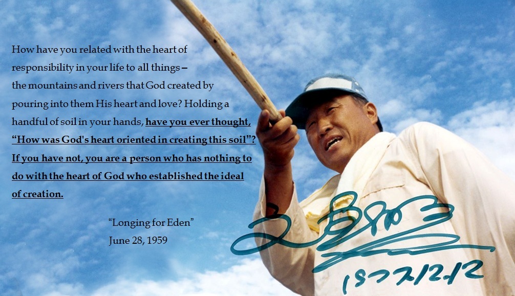 그러면 여러분은 지금까지 생애노정에 있어서 얼마만큼의 책임적인 감정을 갖고 하나님이 정을 기울여 지으신 이 만물을 대했습니까? 혹은 이 산천을 대했습니까? 한 덩이의 흙을 붙들고 이 흙을 빚으신 하나님의 심정이 어떠했겠는 가를 생각해 본 적이 있습니까? 없다 할진대 여러분들은 창조이상을 세우신 하나님의 심정을 무시하는 죄인이 될 것입니다. (6-338~339)