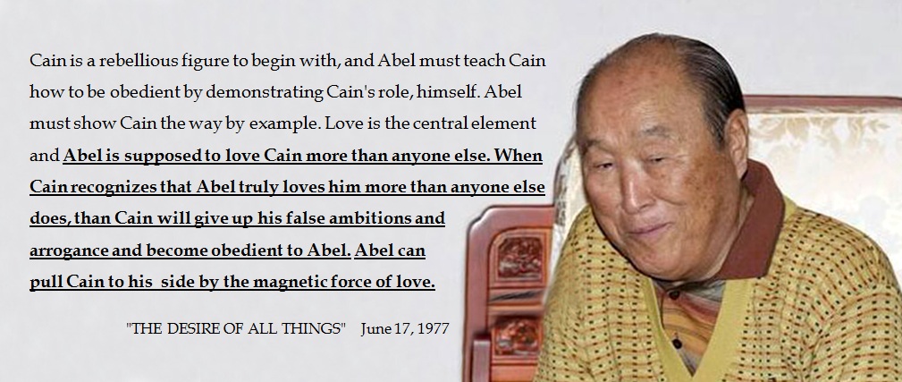 Abel should teach Cain how to be obedient to and united with him. Unification Church members must clearly understand what that means. Often you mistakenly think that Cain was supposed to be subjugated by Abel from the very beginning, but that is wrong. Cain is a rebellious figure to begin with, and Abel must teach Cain how to be obedient by demonstrating Cain's role, himself. Abel must show Cain the way by example. Love is the central element and Abel is supposed to love Cain more than anyone else. When Cain recognizes that Abel truly loves him more than anyone else does, than Cain will give up his false ambitions and arrogance and become obedient to Abel. Abel can pull Cain to his side by the magnetic force of love.