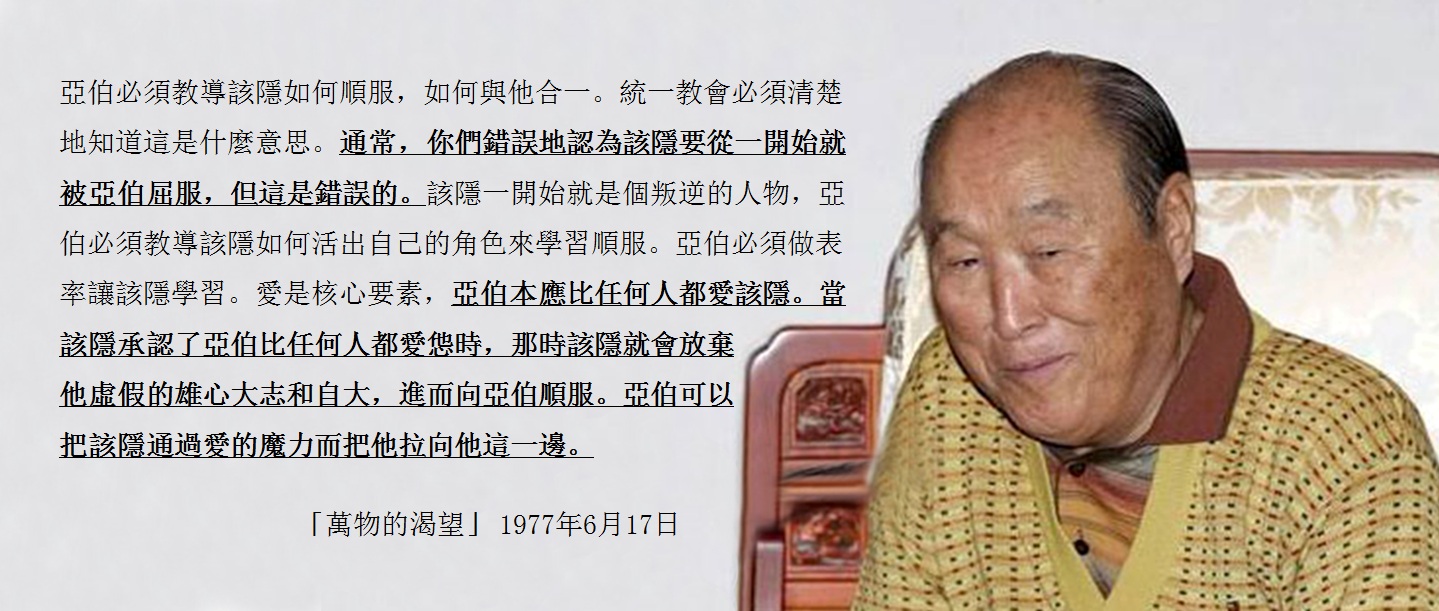 亞伯必須教導該隱如何順服,如何與他合一。統一教會必須清楚地知道這是什麼意思。通常,你們錯誤地認為該隱要從一開始就被亞伯屈服,但這是錯誤的。該隱一開始就是個叛逆的人物,亞伯必須教導該隱如何活出自己的角色來學習順服。亞伯必須做表率讓該隱學習。愛是核心要素,亞伯本應比任何人都愛該隱。當該隱承認了亞伯比任何人都愛怹時,那時該隱就會放棄他虛假的雄心大志和自大,進而向亞伯順服。亞伯可以把該隱通過愛的魔力而把他拉向他這一邊。
