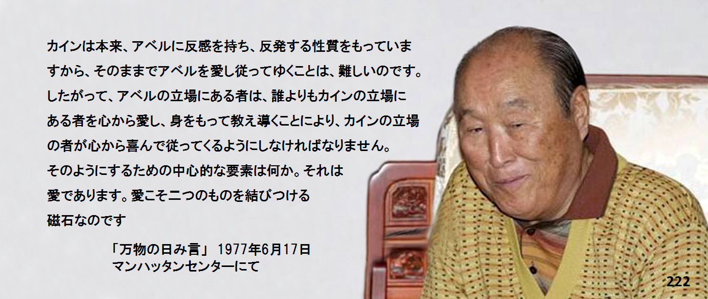 カインは本来、アベルに反感を持ち、反発する性質をもっていますから、そのままでアベルを愛し従ってゆくことは、難しいのです。したがって、アベルの立場にある者は、誰よりもカインの立場にある者を心から愛し、身をもって教え導くことにより、カインの立場の者が心から喜んで従ってくるようにしなければなりません。そのようにするための中心的な要素は何か。それは愛であります。愛こそ二つのものを結びつける磁石なのです。皆さんは私を愛していますか。原理が正しい真理であれば、このように私と皆さんとの間に愛の関係が存在するのは当然のことです。もしそうでなかったら、原理は真理でないでしょうし、私は世界で最もみじめな人間となることでしょう。