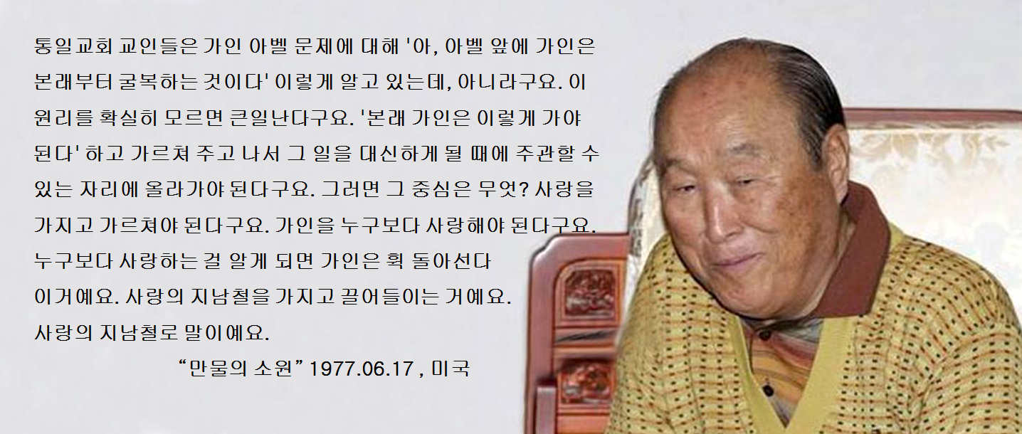 자, 그래서 아벨은 가인이 굴복하는 방법을 가르쳐 주어야 되는 거예요. 가르쳐 주어야 된다 이거예요. 아벨이 가인한테 굴복하는 방법을 가르쳐 주어야 돼요. 그러면 승리하니까. 여기 통일교회 교인들은 가인 아벨 문제에 대해 '아, 아벨 앞에 가인은 본래부터 굴복하는 것이다' 이렇게 알고 있는데, 아니라구요. 이 원리를 확실히 모르면 큰일난다구요. '본래 가인은 이렇게 가야 된다' 하고 가르쳐 주고 나서 그 일을 대신하게 될 때에 주관할 수 있는 자리에 올라가야 된다구요. 그러면 그 중심은 무엇? 사랑을 가지고 가르쳐야 된다구요. 가인을 누구보다 사랑해야 된다구요. 누구보다 사랑하는 걸 알게 되면 가인은 휙 돌아선다 이거예요. 사랑의 지남철을 가지고 끌어들이는 거예요. 사랑의 지남철로 말이예요.