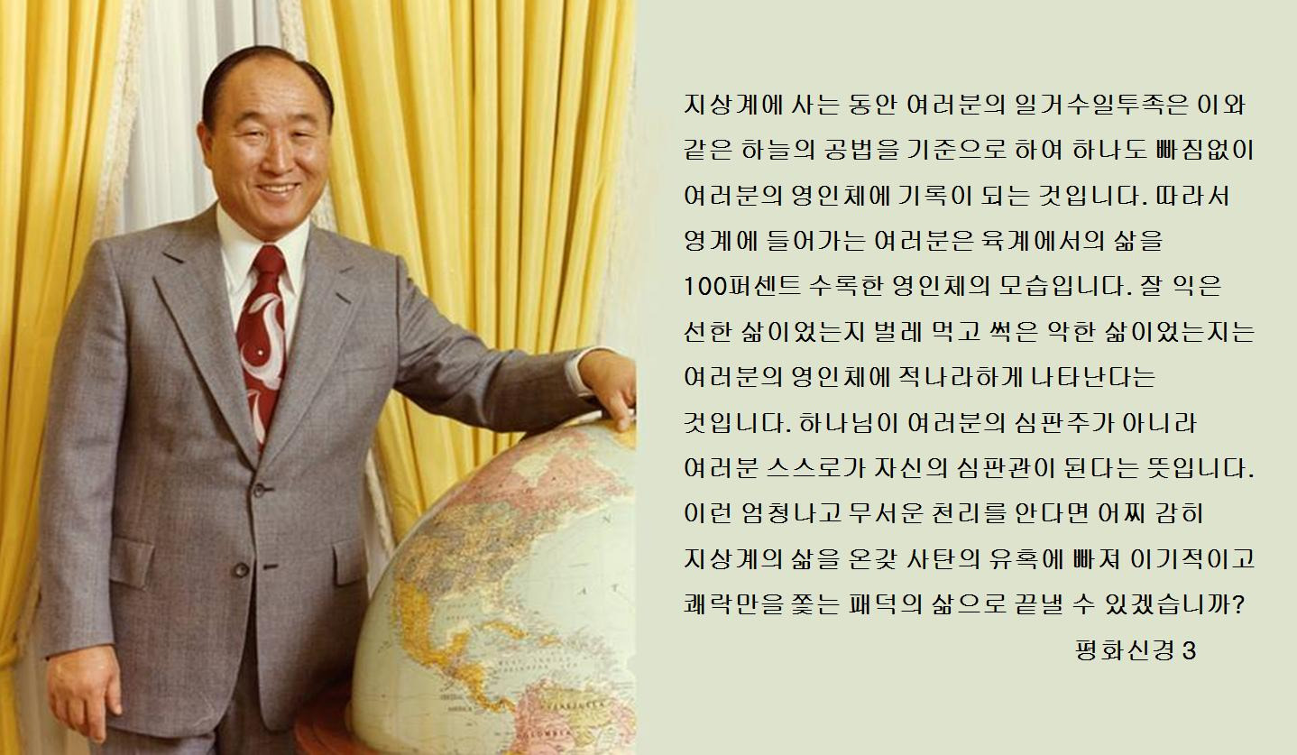 그런데 인간의 영인체와 육신의 관계를 놓고 볼 때, 보다 더 중요한 것은 육신이 아니라 영인체라는 것입니다. 육신은 한 100년쯤 버티다가 간다고 하지만, 영인체는 시간과 공간권을 초월하여 영생하는 것입니다. 제아무리 지상계에서 호의호식하며 잘사는 사람도 결국 죽는 것입니다. 따라서 여러분의 삶은 영적인 기준과 육적인 기준을 잘 조화시켜 영육이 합한 완성실체를 이루어 살다가 가야 합니다. 현상세계요 유한세계인 지상계의 삶에서 육신을 터로 하여 영인체를 완성시켜야 하는 책임이 있다는 말입니다. 그렇다고 해서 영인체의 완성이 자동적으로 오는 것이 아닙니다. 반드시 참사랑의 실천을 통해서 몸과 마음이 완전 일체가 된 삶의 터 위에서라야 완숙한 영인체가 결과 맺어진다는 것입니다.